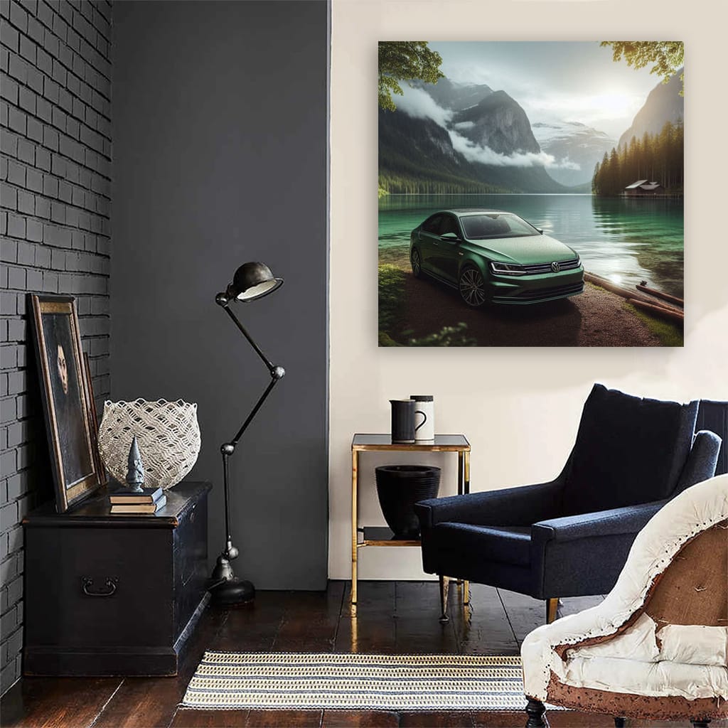 This poster is pure adrenaline for car enthusiasts! The painting shows a Volkswagen Jetta GLI against the backdrop of a calm lake. Wall art that says: "I live for speed". Catch the moment when style and power merge into one! See more from the collection: Volkswagen Art