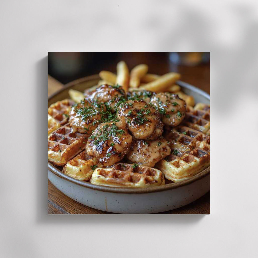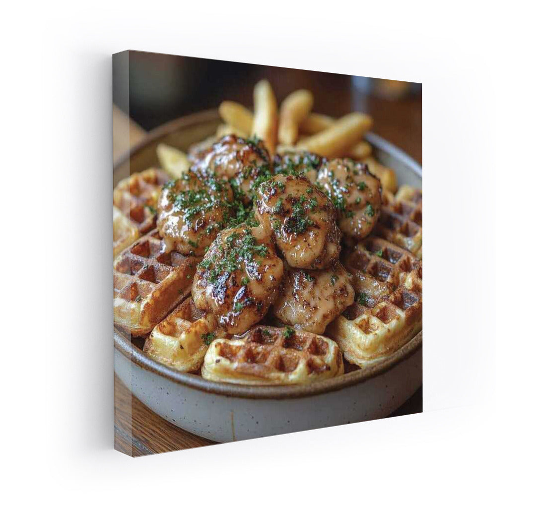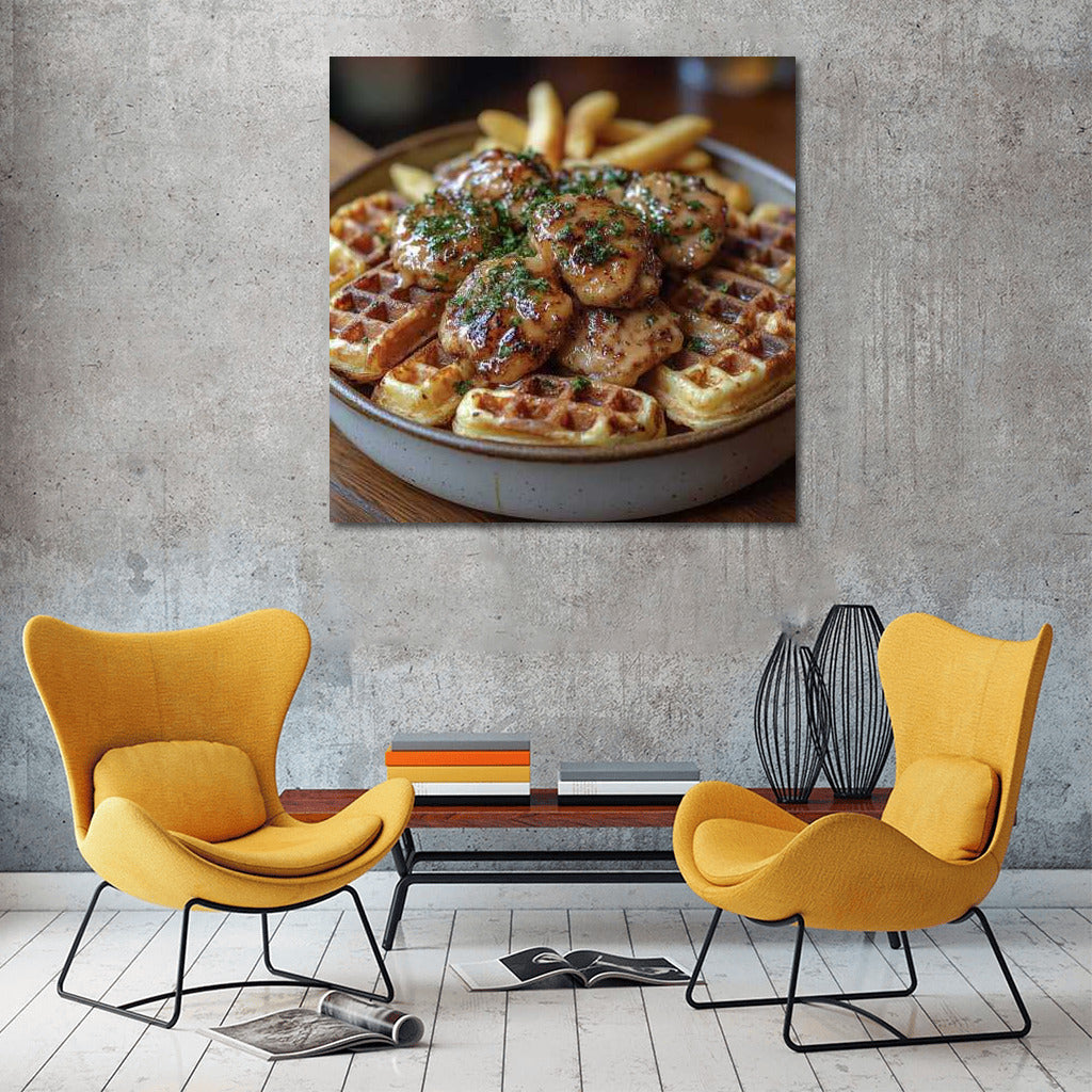 Wall art where waffles and chicken dance in harmony of flavors. A poster that awakens the morning appetite through the art of food. See more from the collection: Baked Goods Art