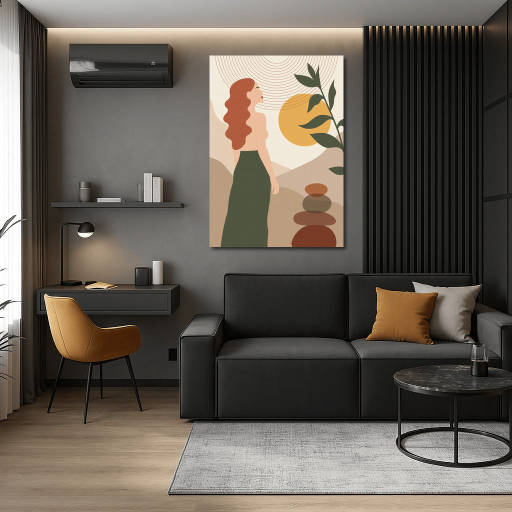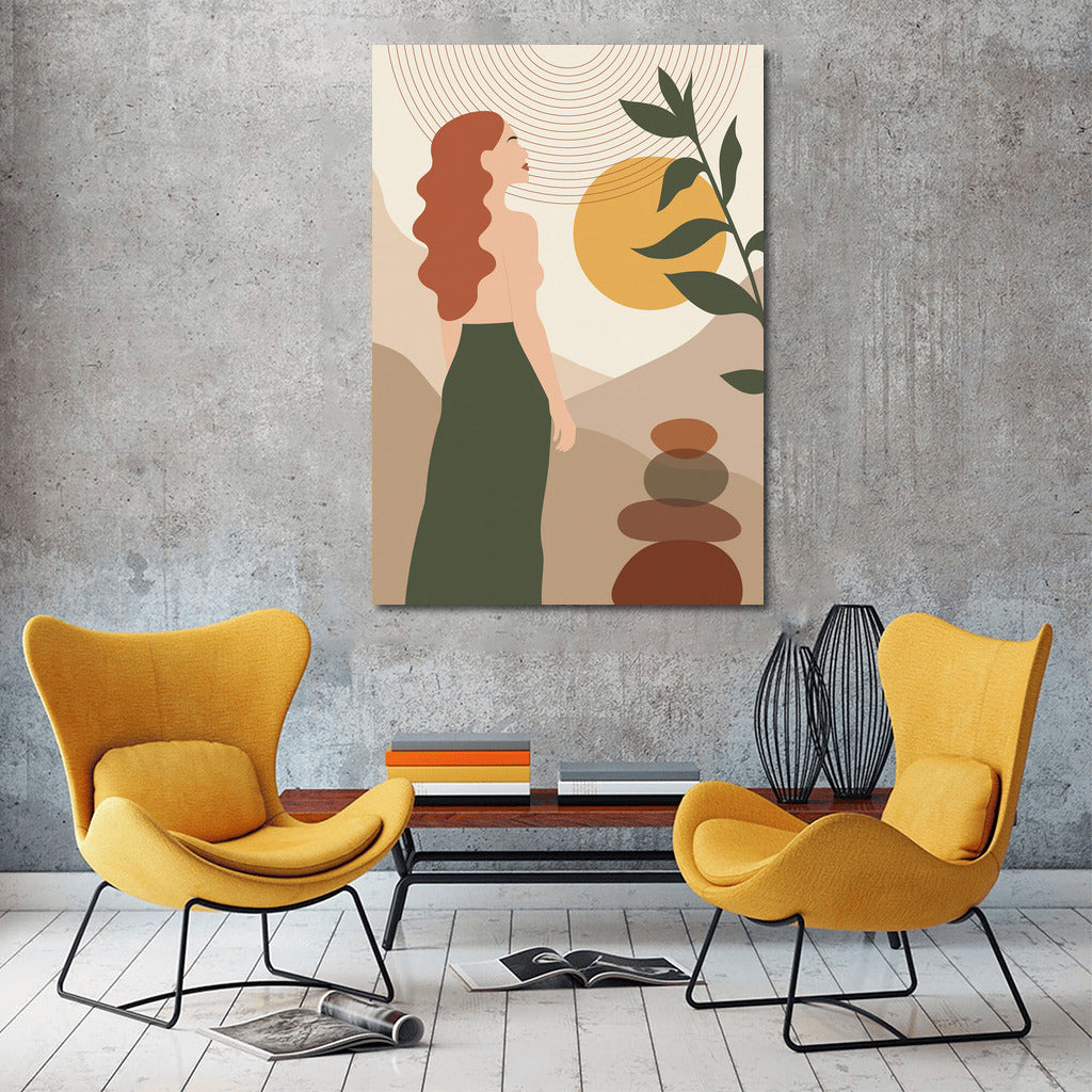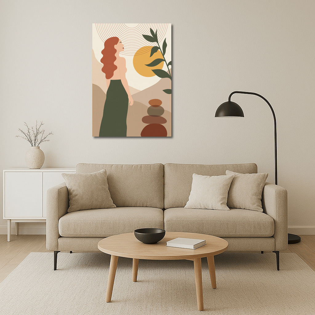Abstract poster with warm boho charm: mysterious figure, sun and nature create an atmosphere of harmony and freedom. See more from the collection: Boho / Bohemian Style Art