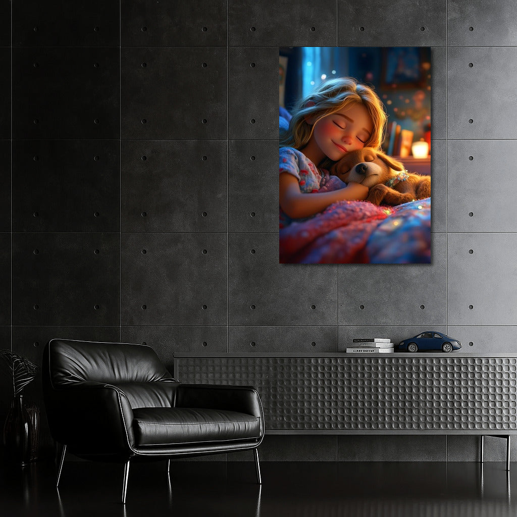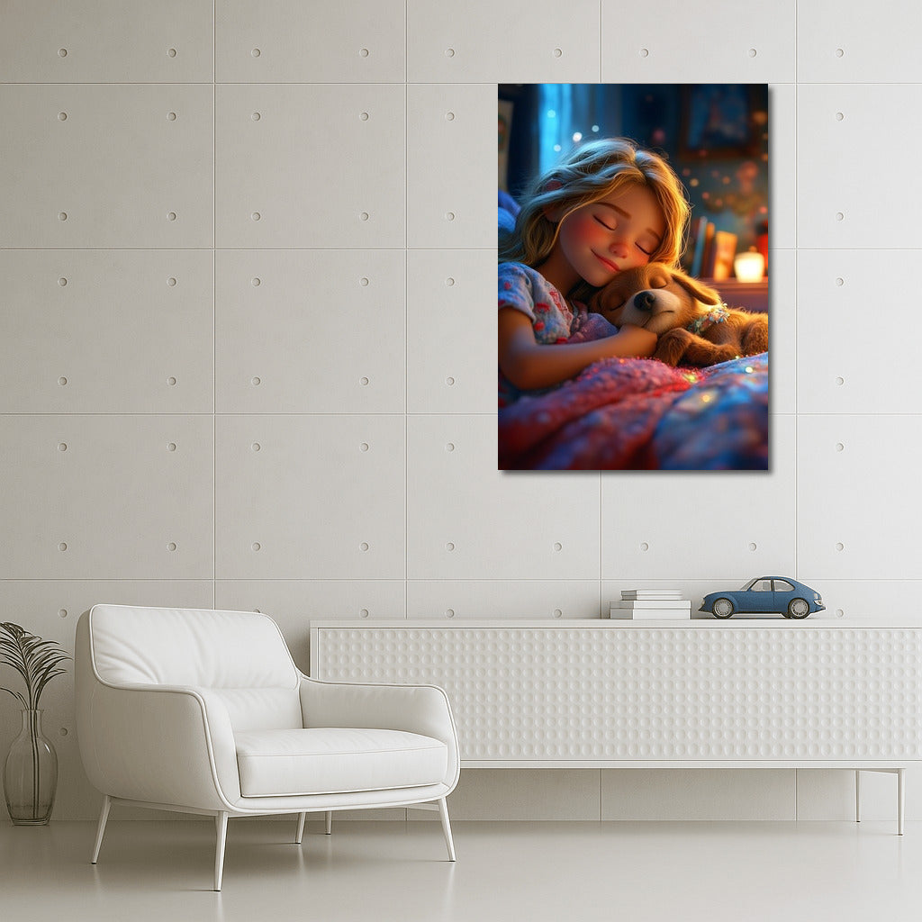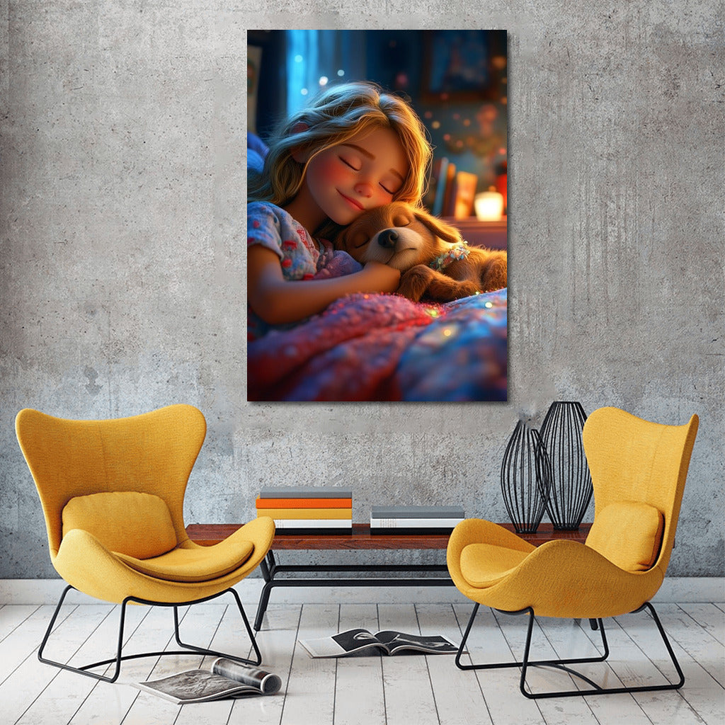 Sweet dreams: the girl and puppy in this painting create an atmosphere of coziness and peace. The perfect poster for your home! See more from the collection: Cartoon Art