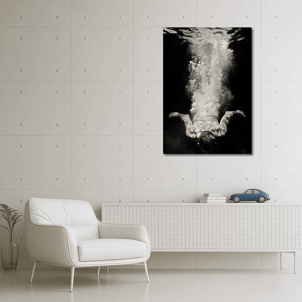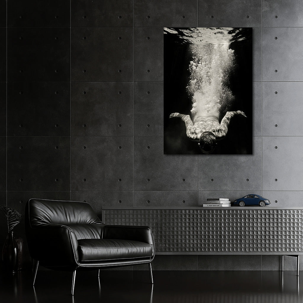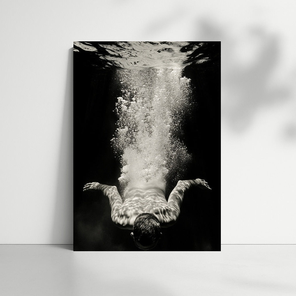 Dive into silence: a poster with breathtaking water movement that creates the effect of free flight. Wall art with depth. See more from the collection: Black and White Art