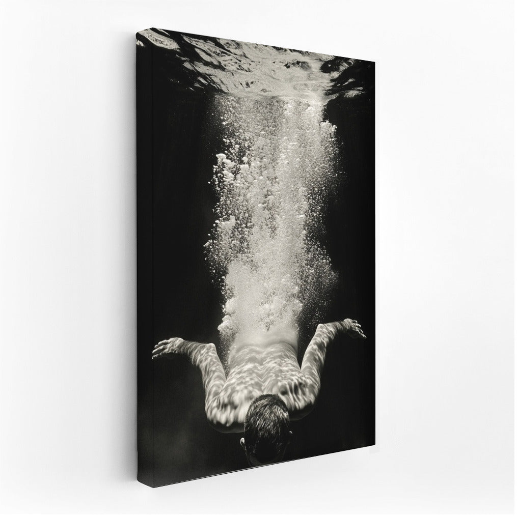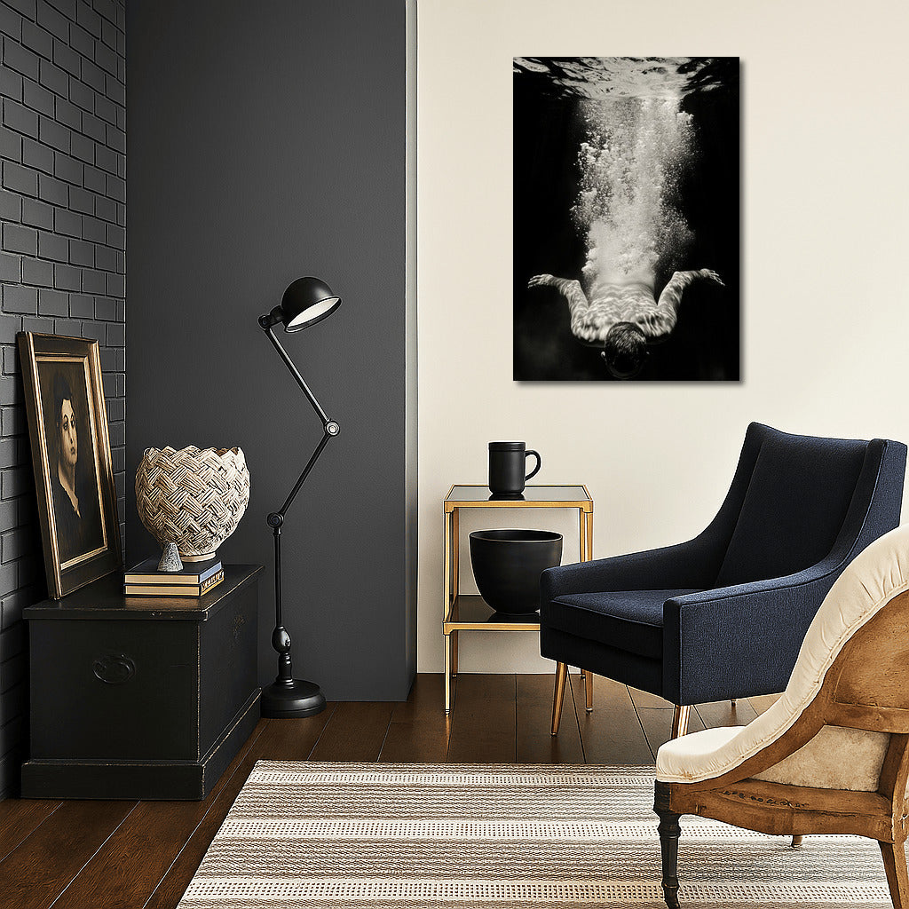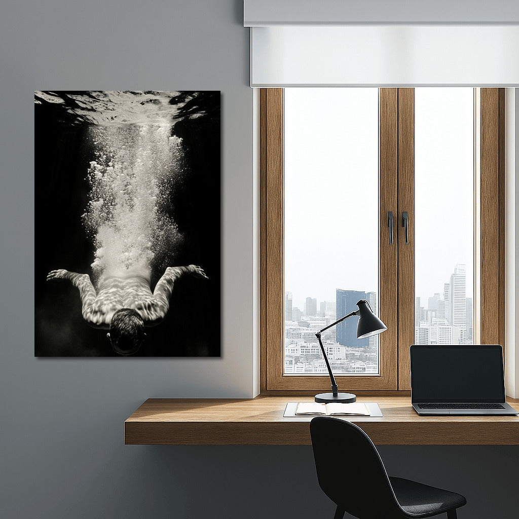 Dive into silence: a poster with breathtaking water movement that creates the effect of free flight. Wall art with depth. See more from the collection: Black and White Art