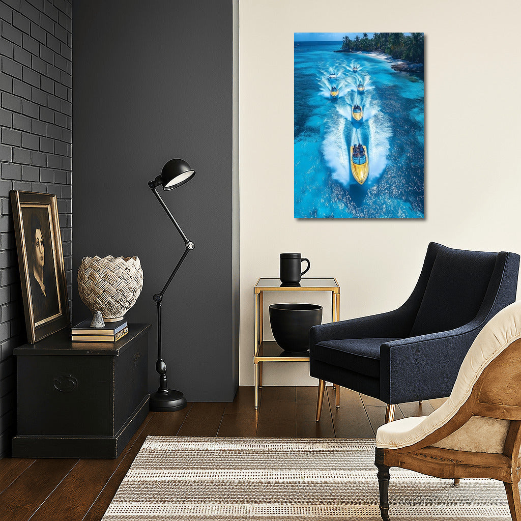 Enjoy the speed and freedom with this painting! Bright boats rush across the azure water, adding dynamics to your wall art. See more from the collection: Boats Art