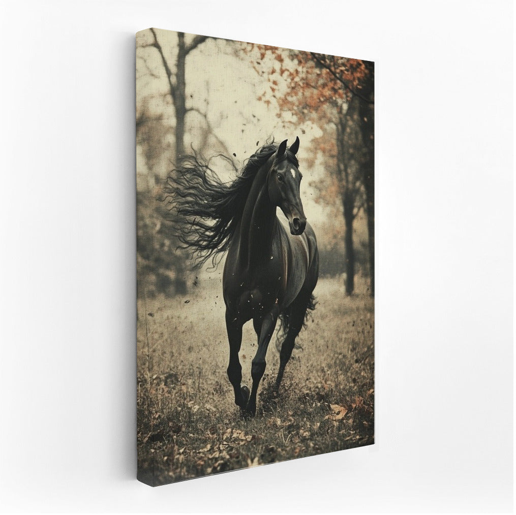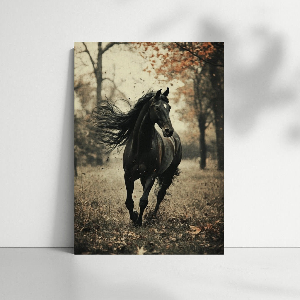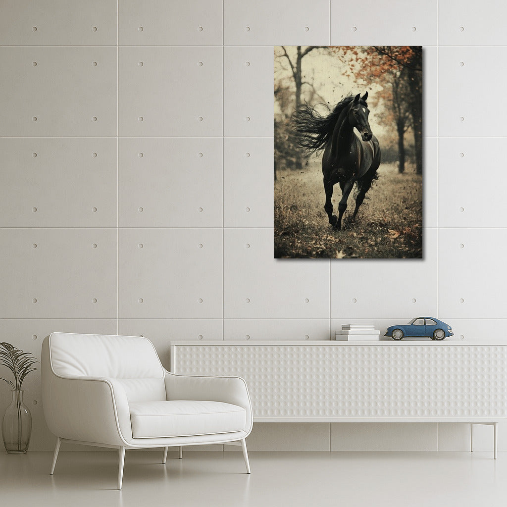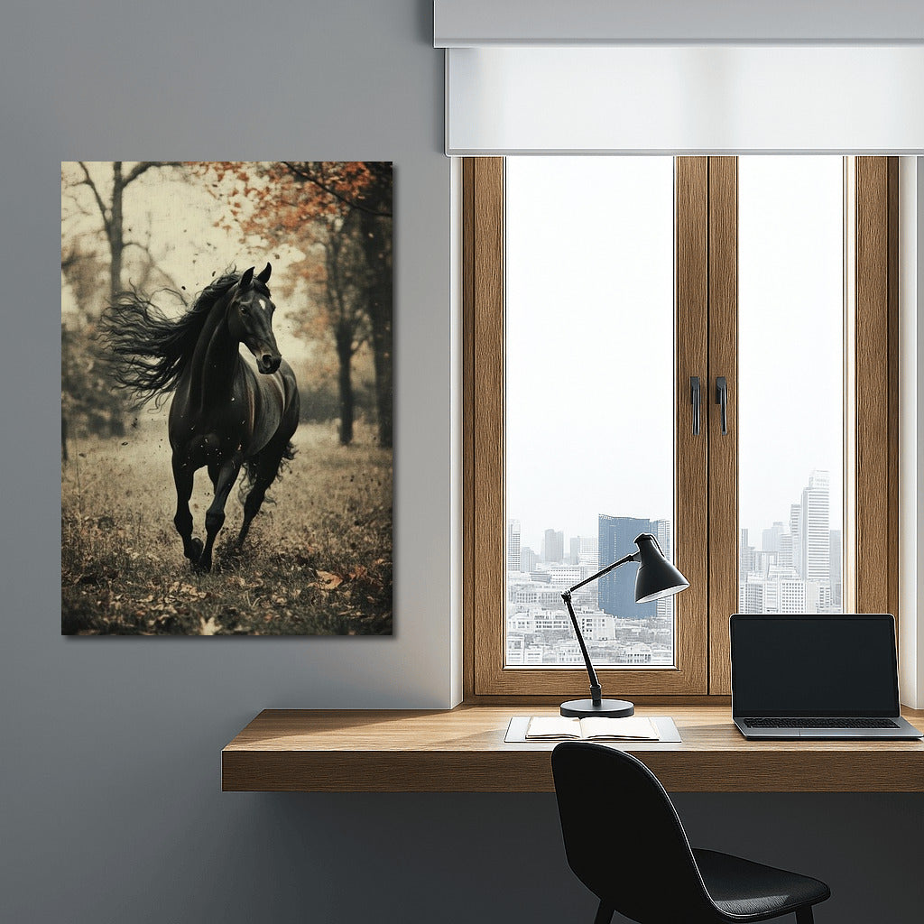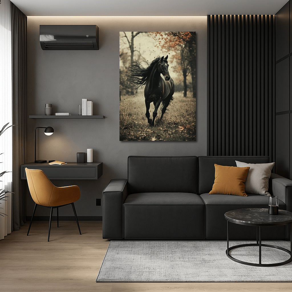 The element of freedom in this painting: a graceful black horse in an autumn forest. Ideal wall art for dynamic interiors. See more from the collection: Animals Art