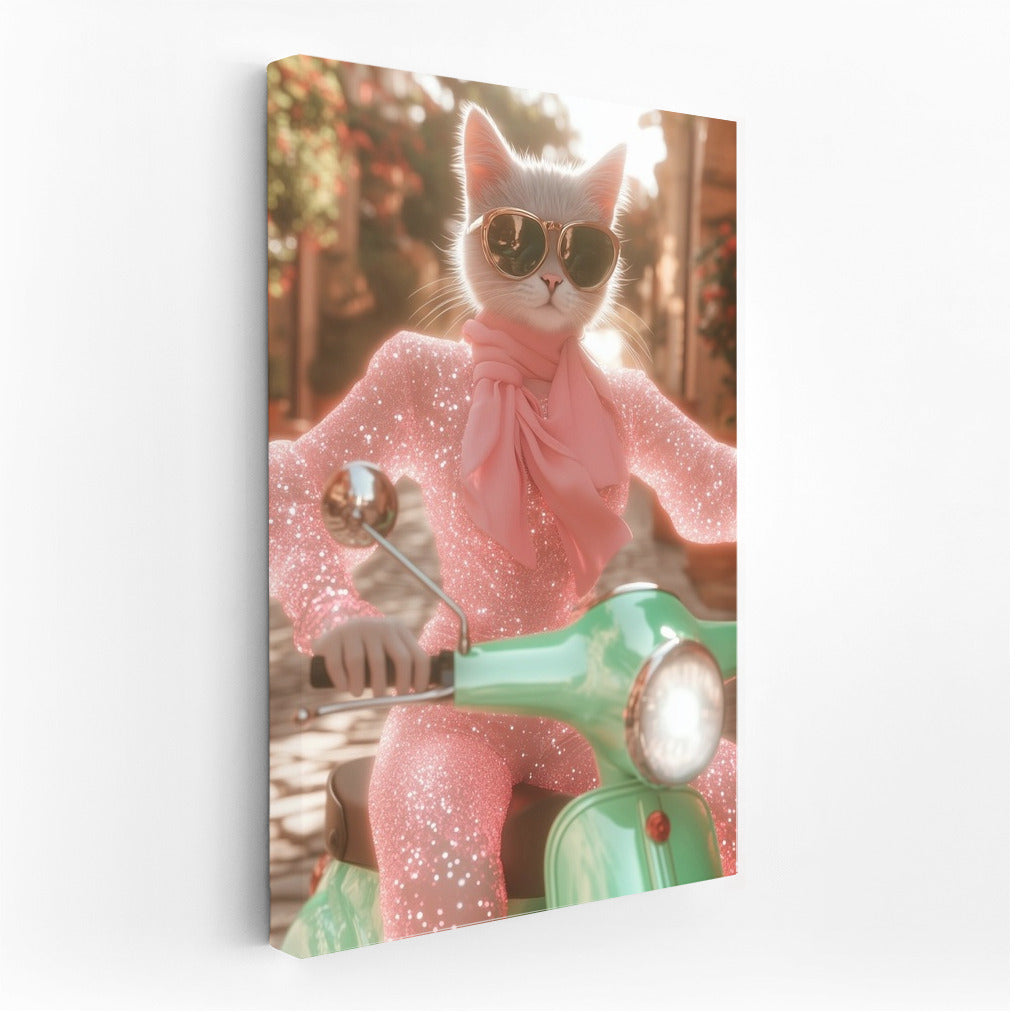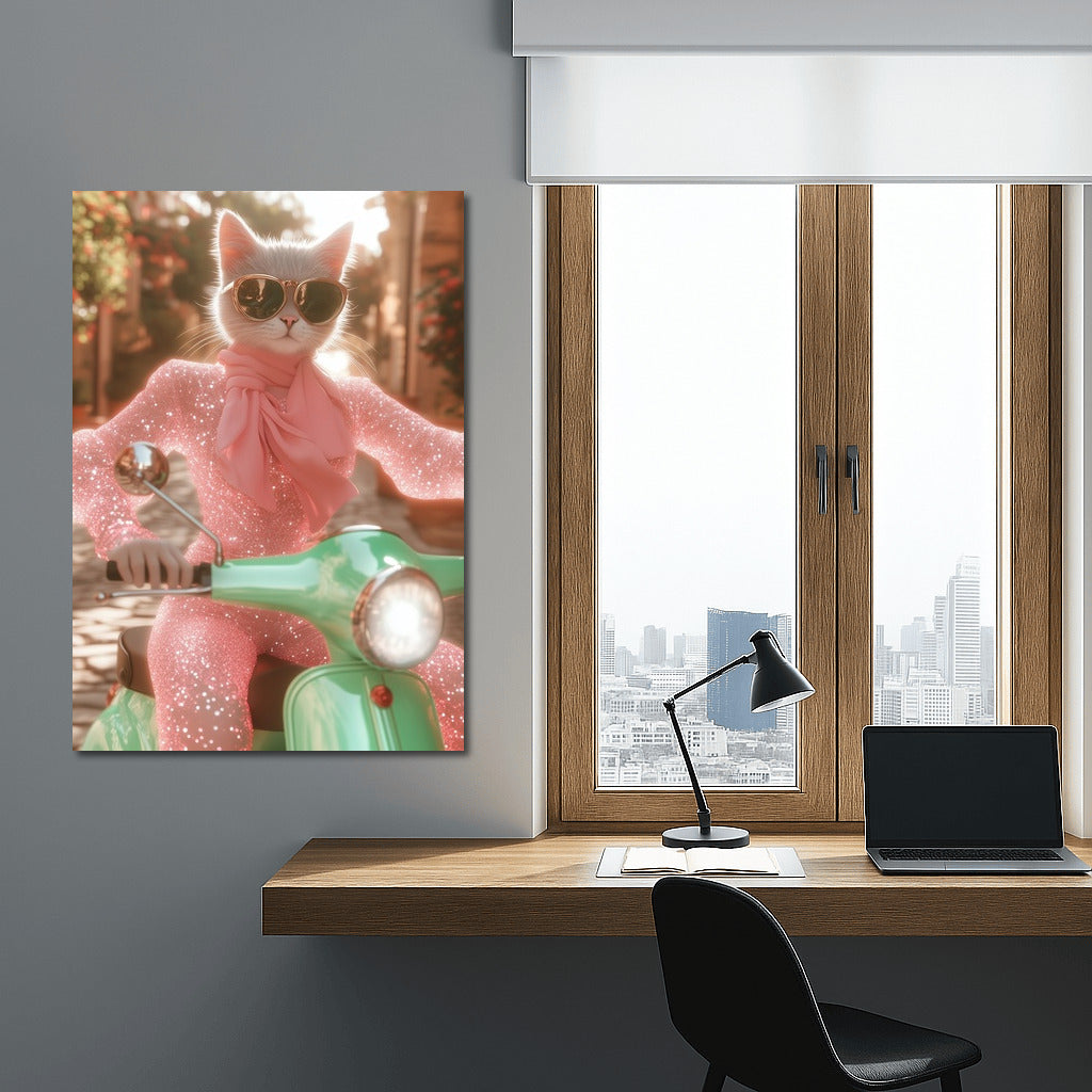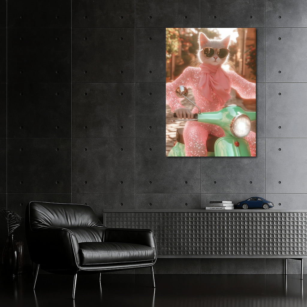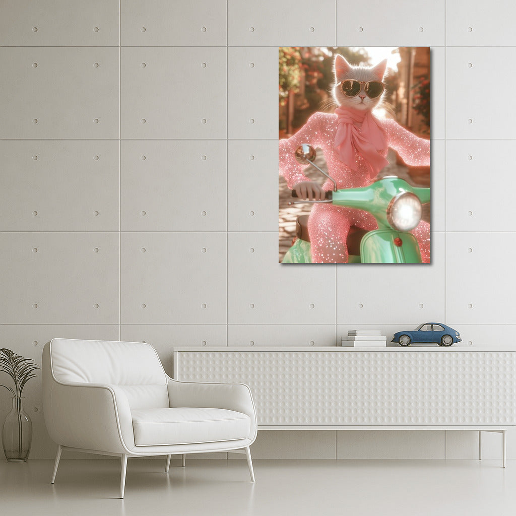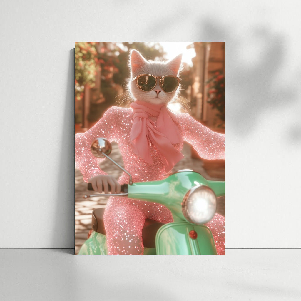 Adorable painting of a stylish cat on a green Vespa scooter. Perfect wall art to add some flair to your interior! See more from the collection: Animals Art