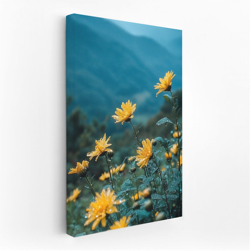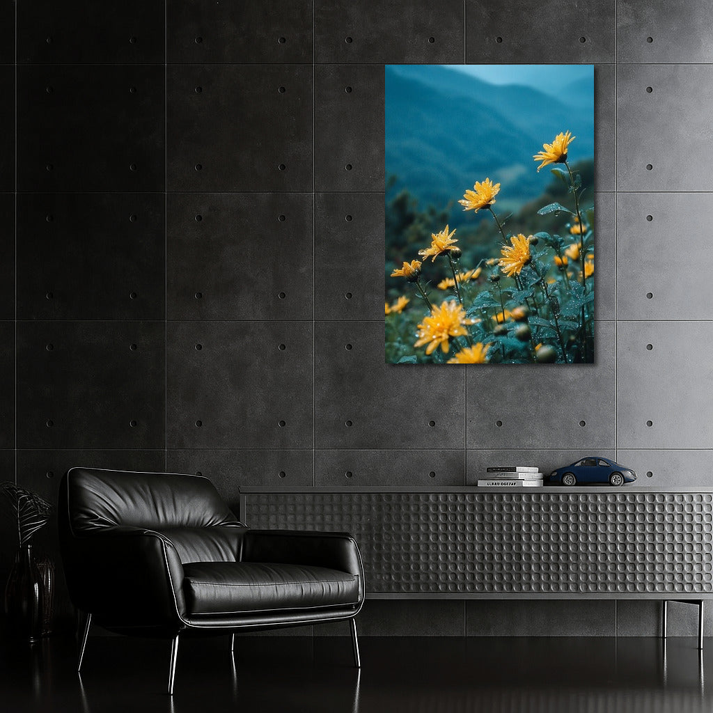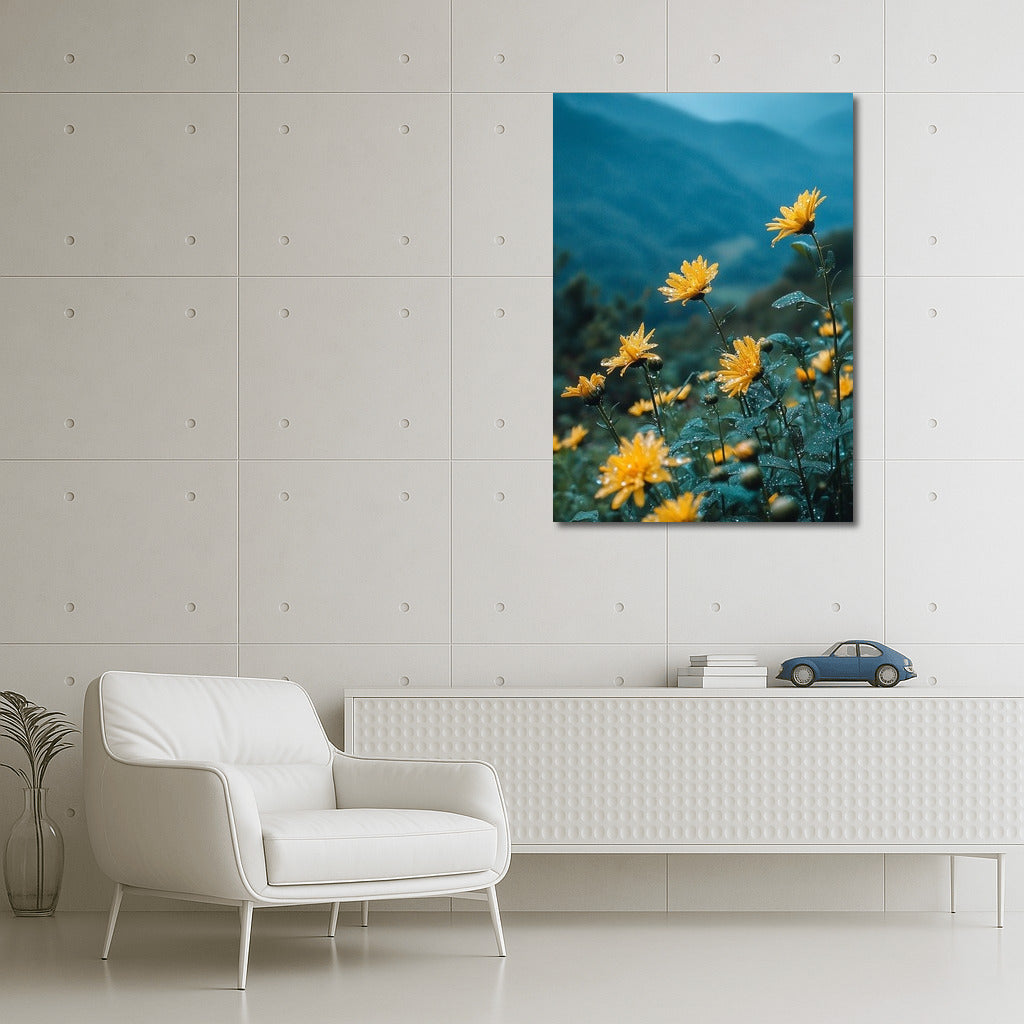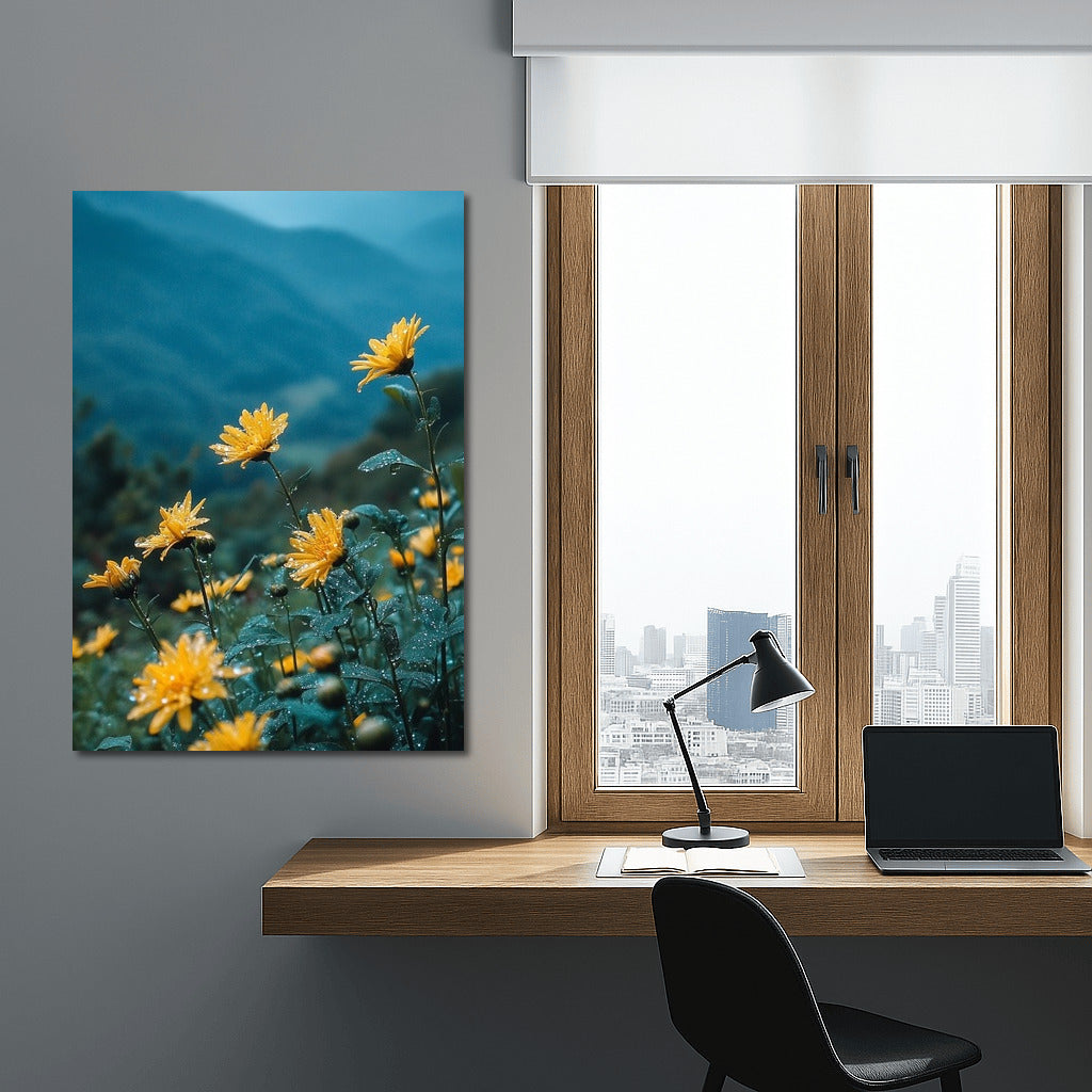 Bright flowers against a foggy landscape. The painting envelops your space with a quiet whisper of nature. Perfect wall art. See more from the collection: Flowers Art