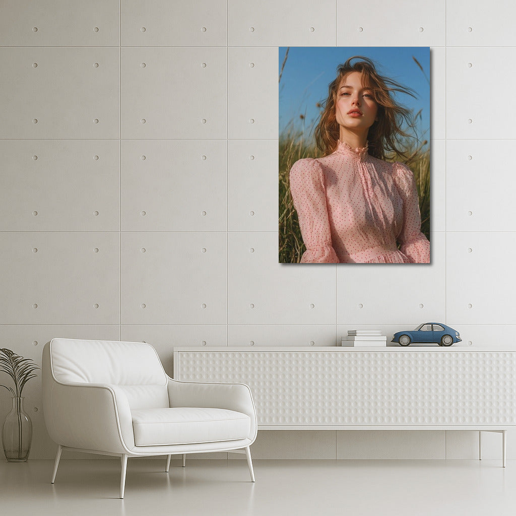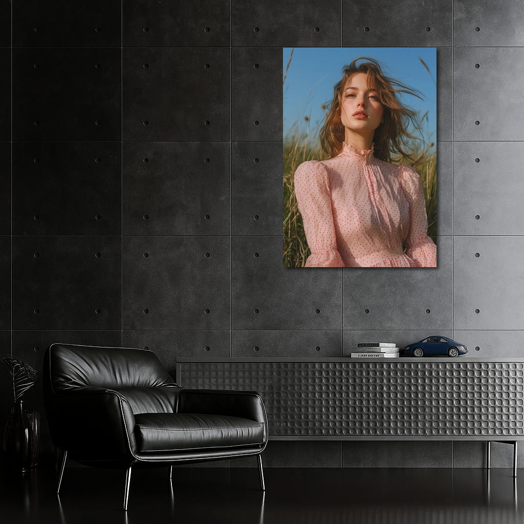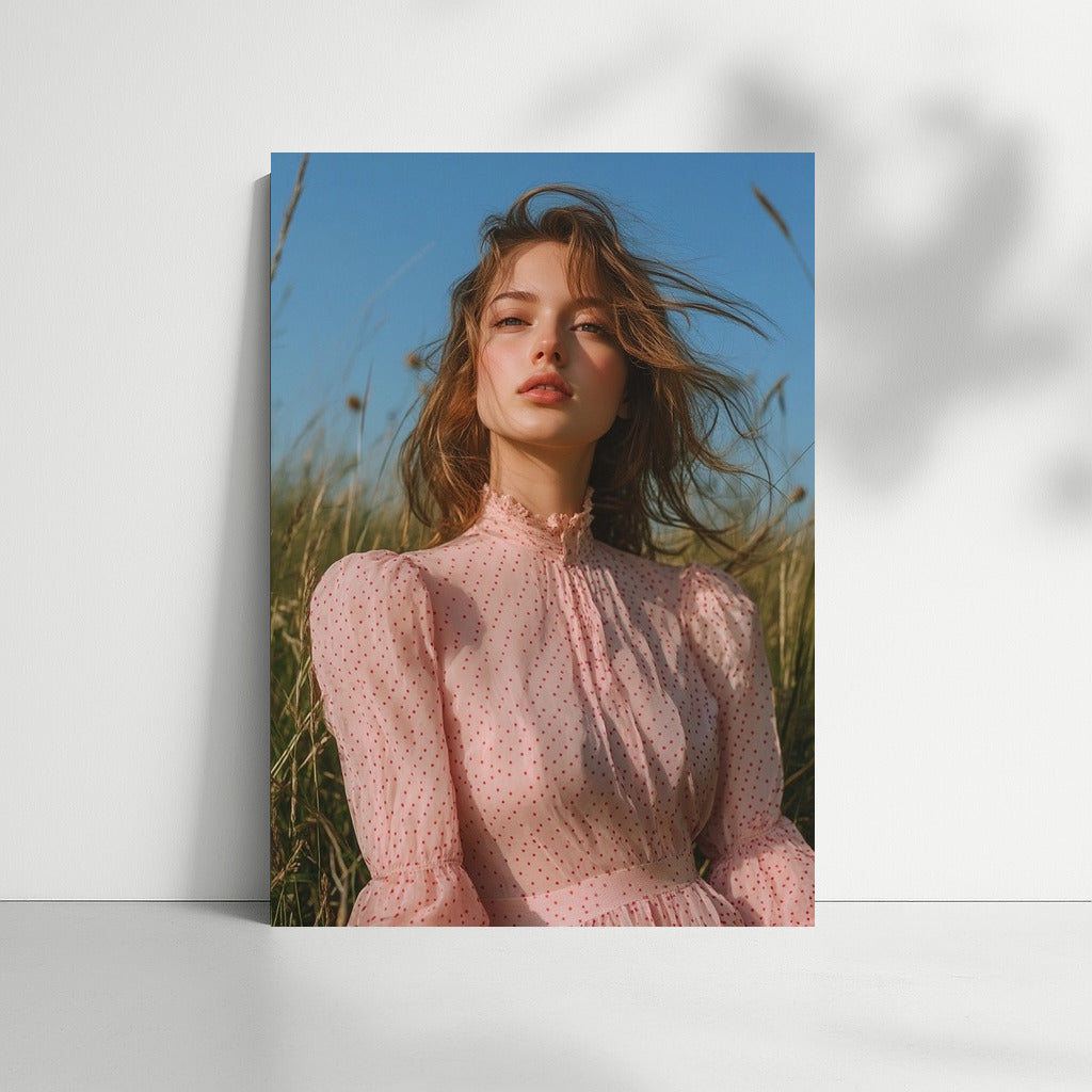 Light breath of a dream: a poster with a gentle image against the background of meadows and sky. Decorate the space with this sophisticated painting! See more from the collection: Wall Art with Women