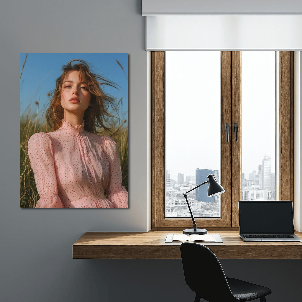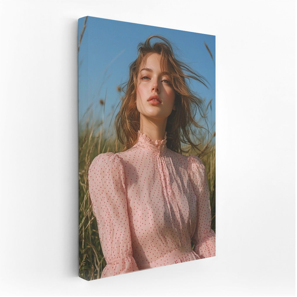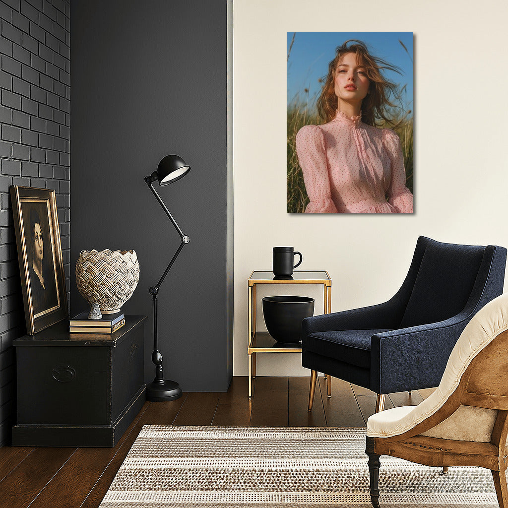 Light breath of a dream: a poster with a gentle image against the background of meadows and sky. Decorate the space with this sophisticated painting! See more from the collection: Wall Art with Women