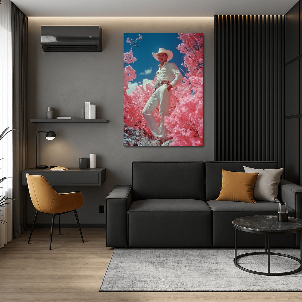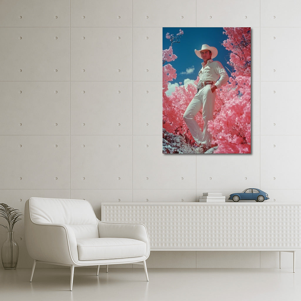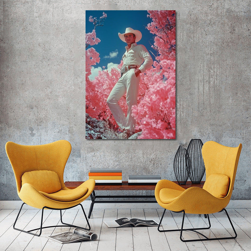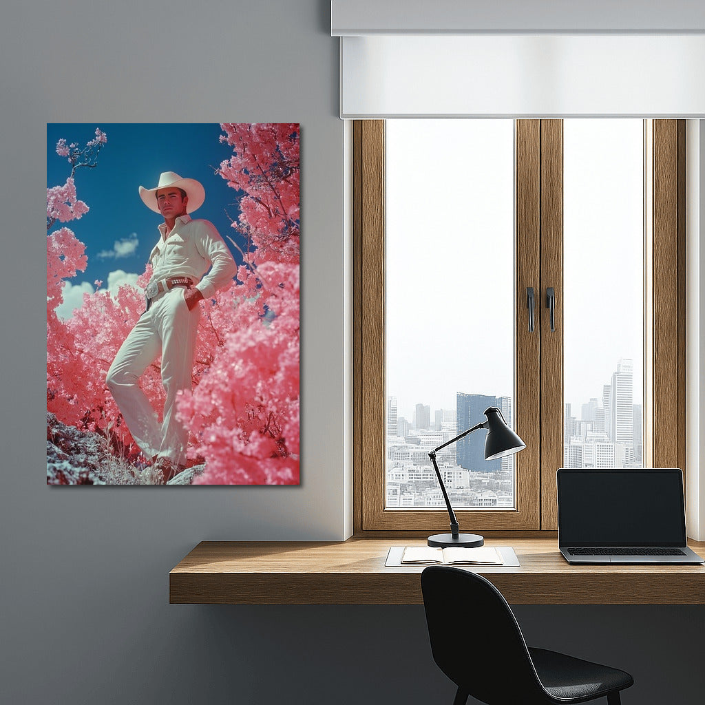 A bright poster with a mysterious figure in a hat among pink trees. Wall art for dreamers and lovers of the unusual. See more from the collection: Mixed Wall Art