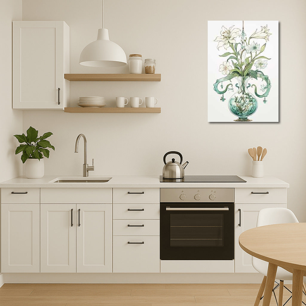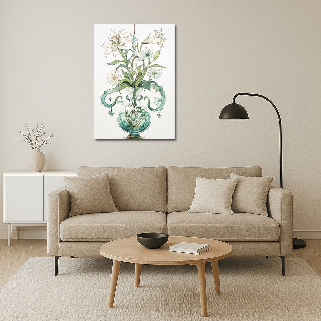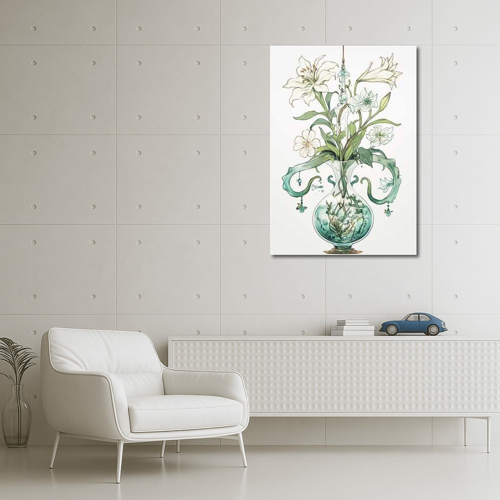 Fantastic poster painting: white lilies in a futuristic vase. Modern wall art will liven up any space. See more from the collection: Flowers Art