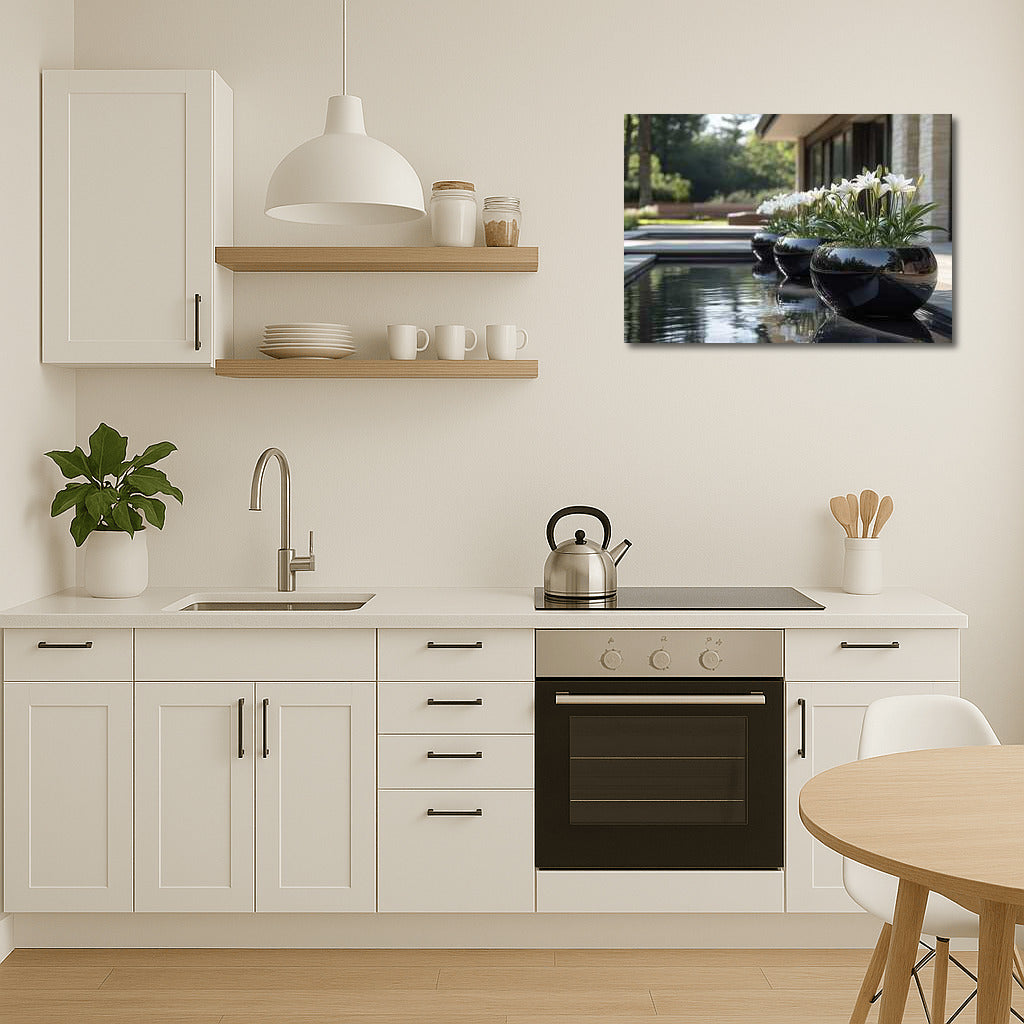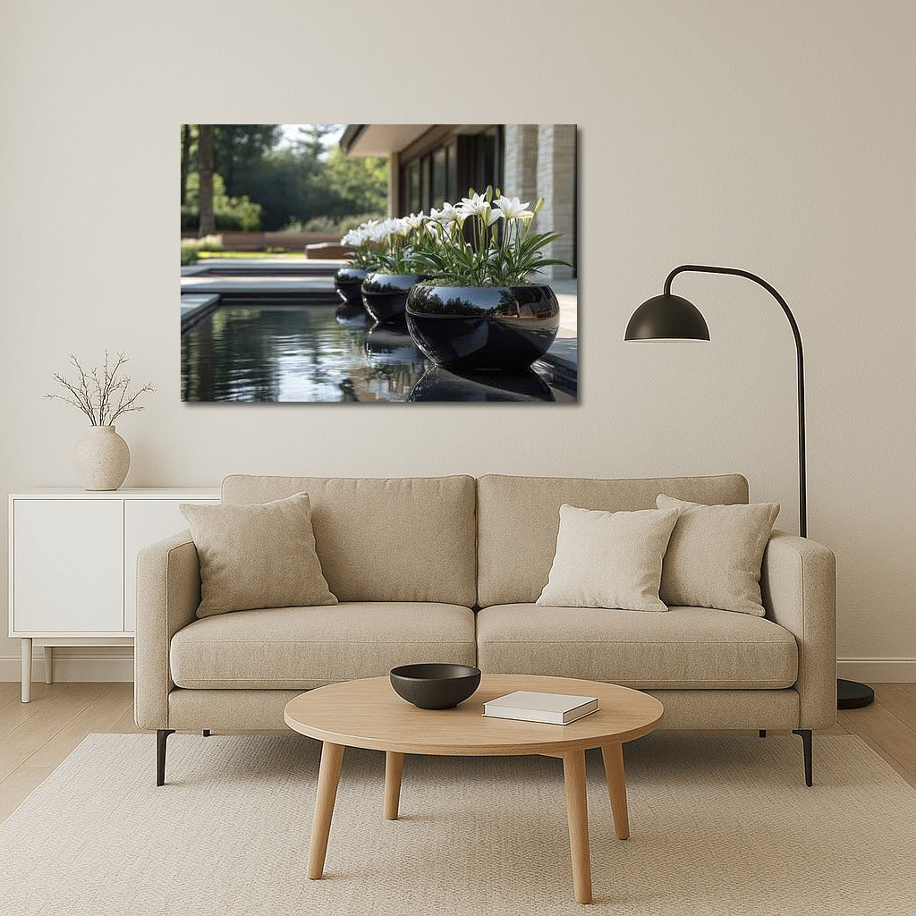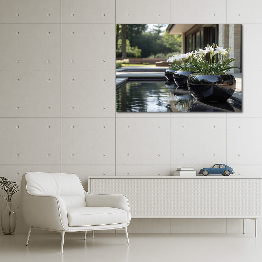 Elegant white lilies in shiny vases will transform your home into an oasis. Perfect wall art for tranquility. See more from the collection: Flowers Art