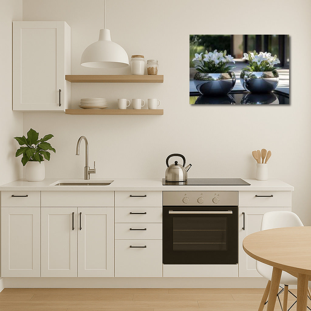 Elegant white lilies in sparkling vases. Add tranquility and style to your interior with this art painting. See more from the collection: Flowers Art
