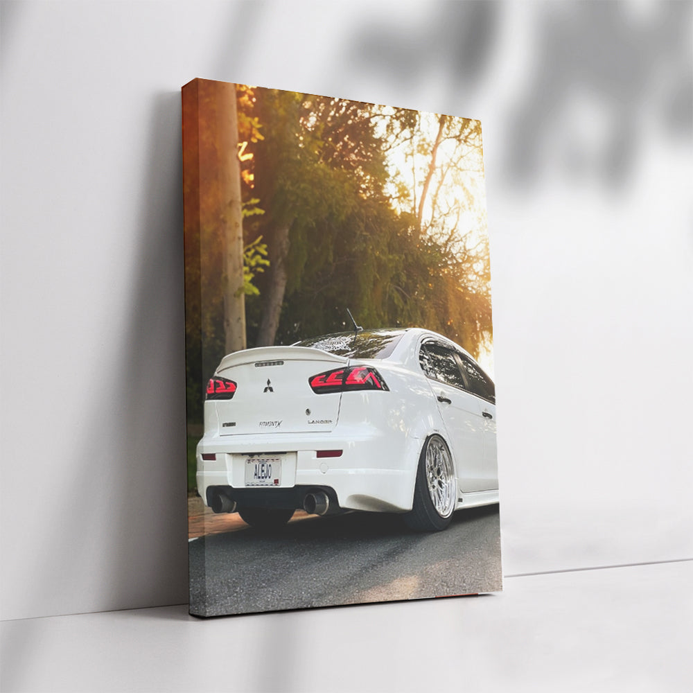 White Mitsubishi Lancer at Sunset - Sporty Elegance Wall Art