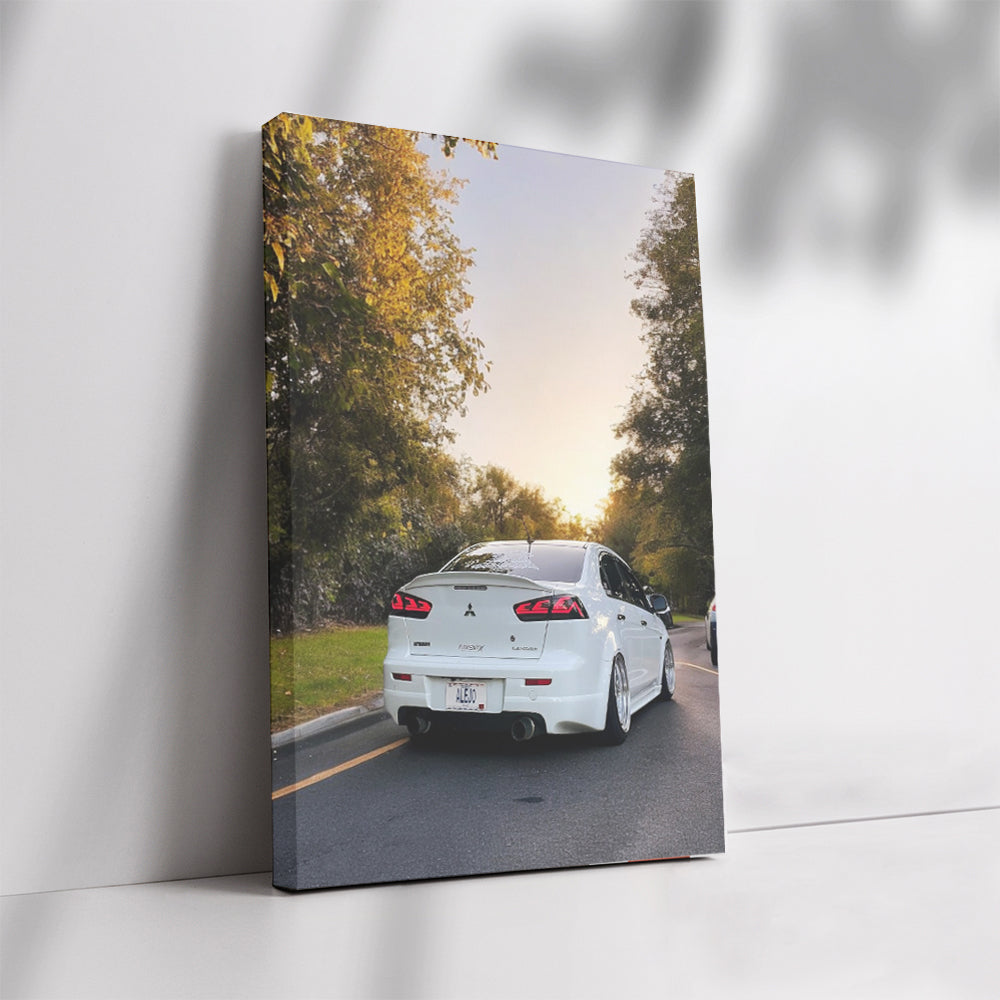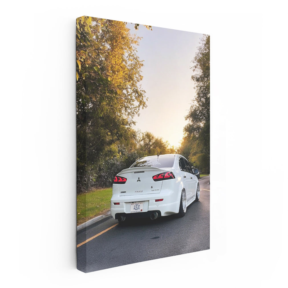 White Mitsubishi Lancer at Sunset - Sporty Elegance Wall Art