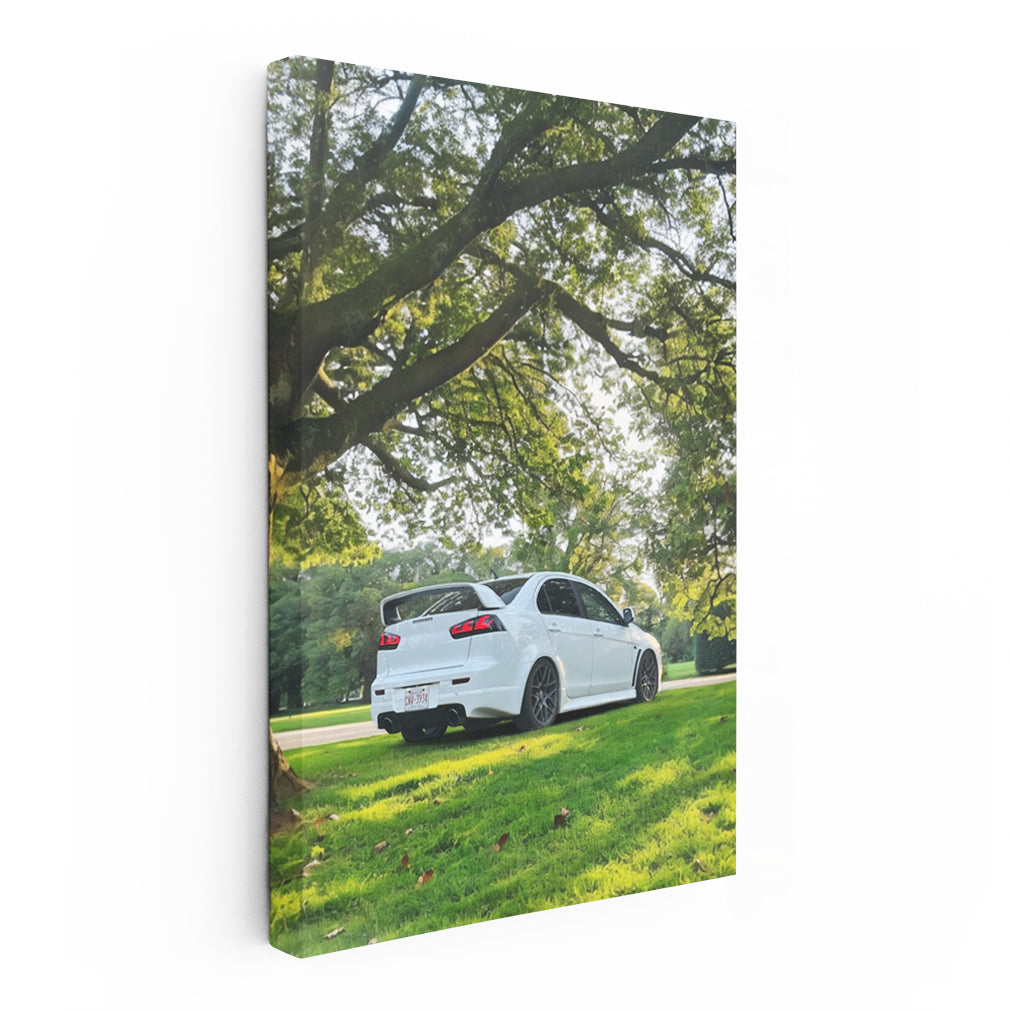 What a poster! A white Mitsubishi Lancer against a park backdrop - like a drifting samurai in the wild. This painting is a car lover's dream, it will add a bold touch to your wall art. A treat for those who live fast and love Japanese style. See more from the collection: Mitsubishi Art