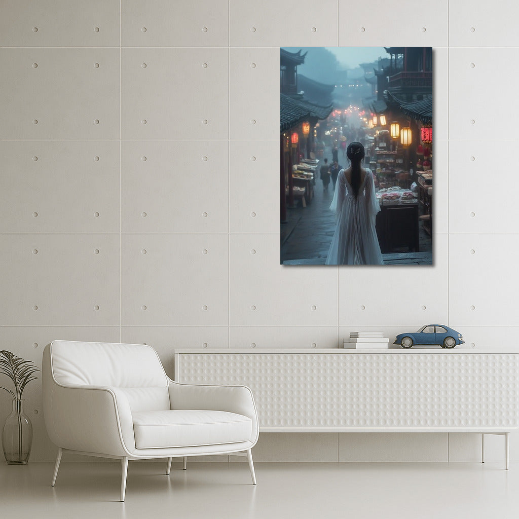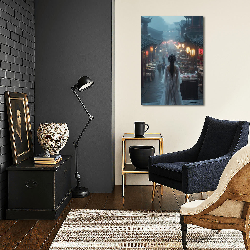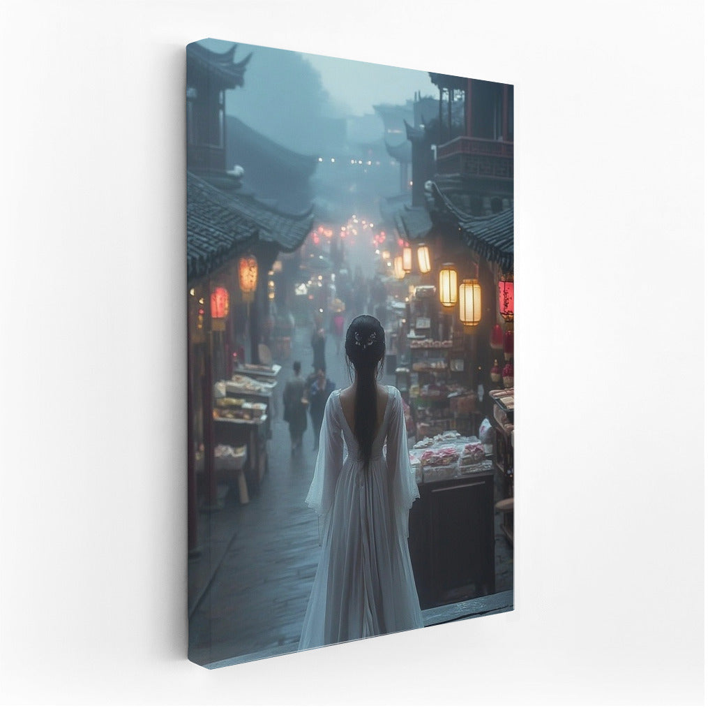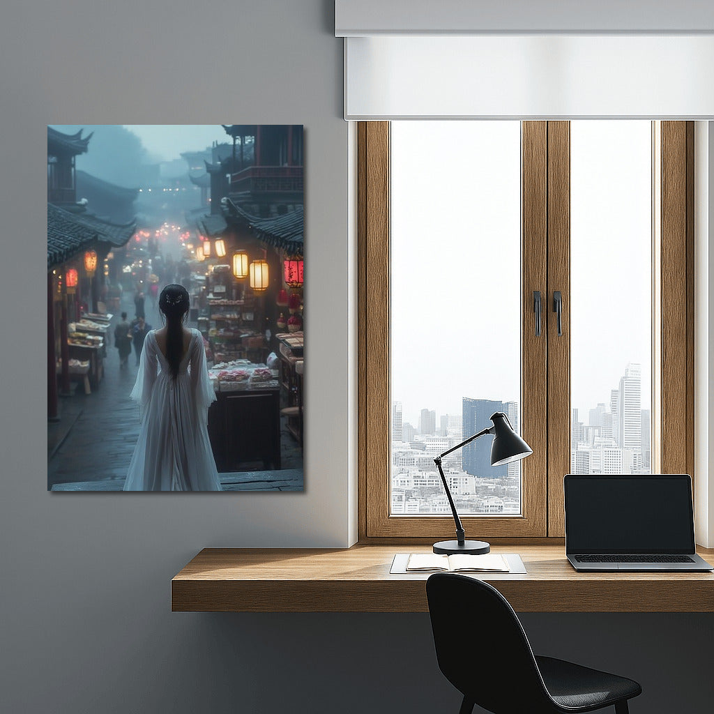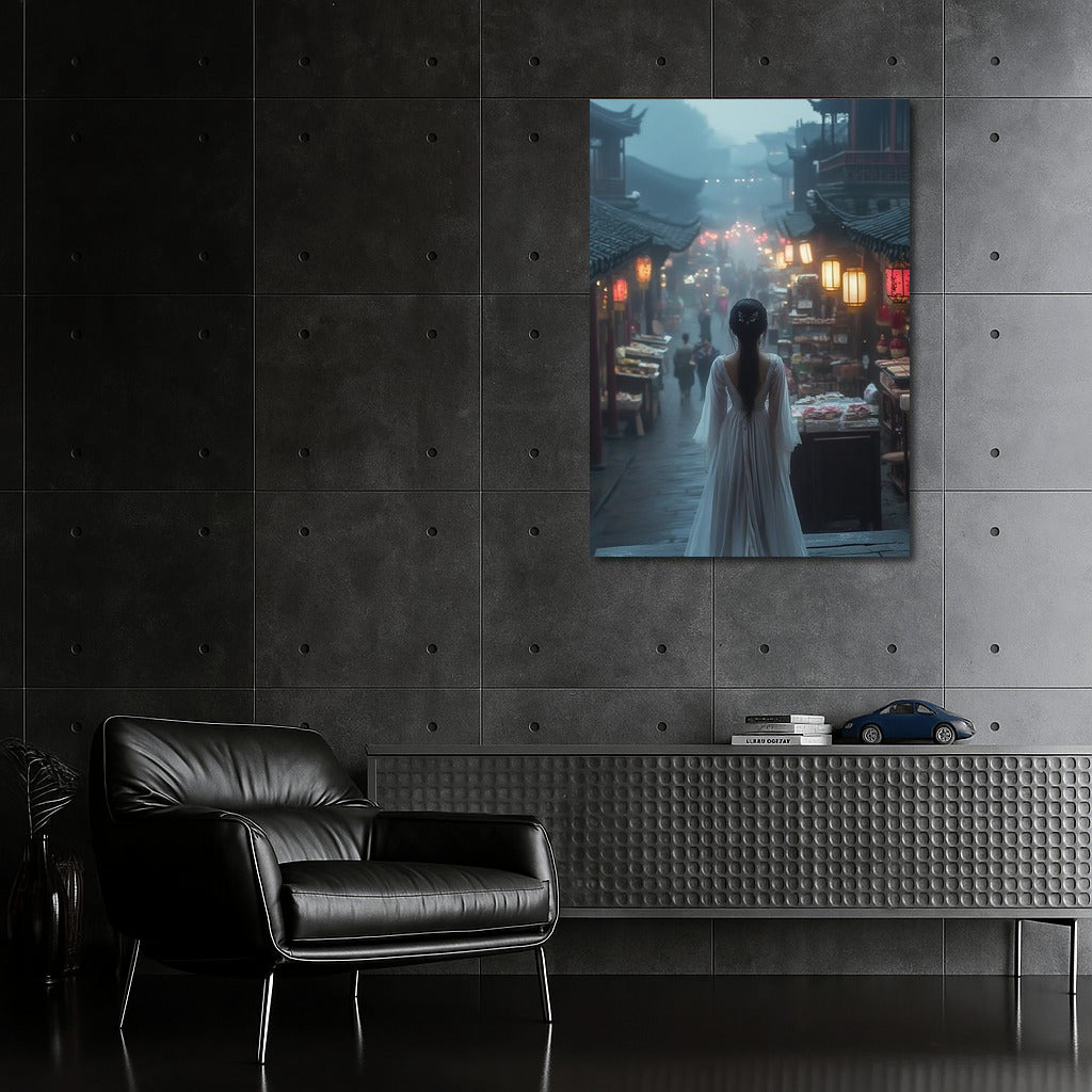 Fascinating poster: a mysterious figure in white against the backdrop of an ancient eastern city. Immerse yourself in the atmosphere of silence and mystery. See more from the collection: Mixed Wall Art