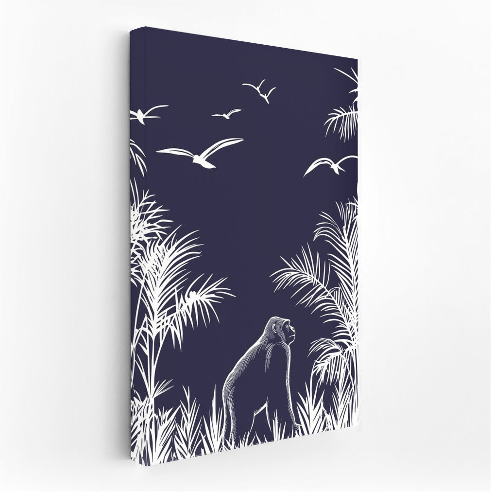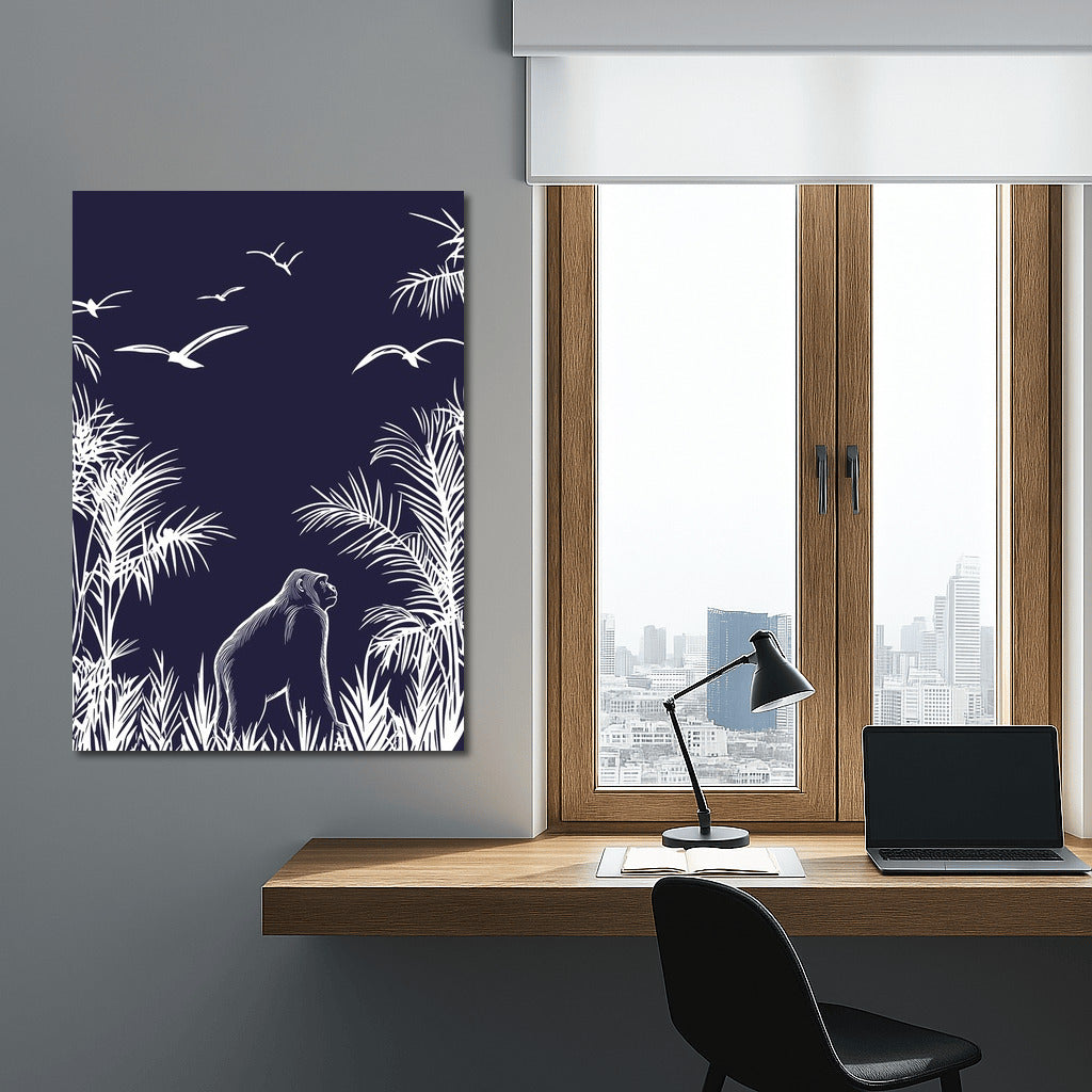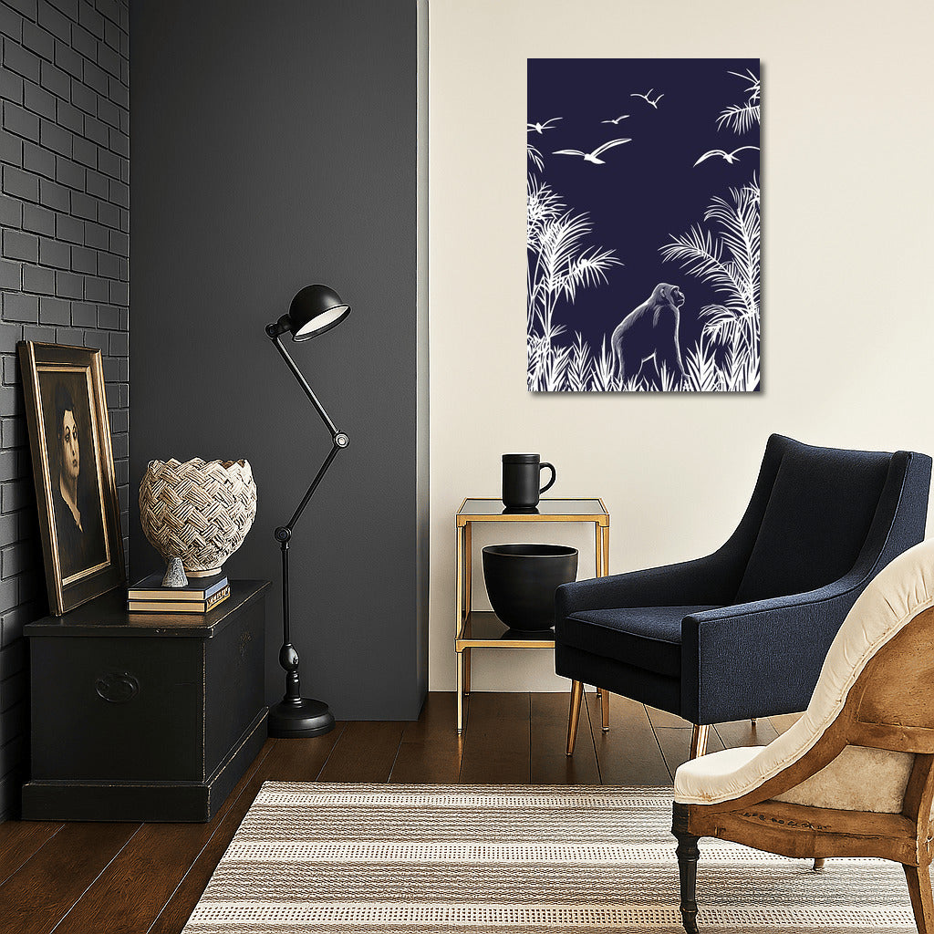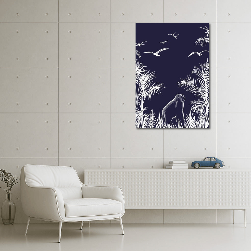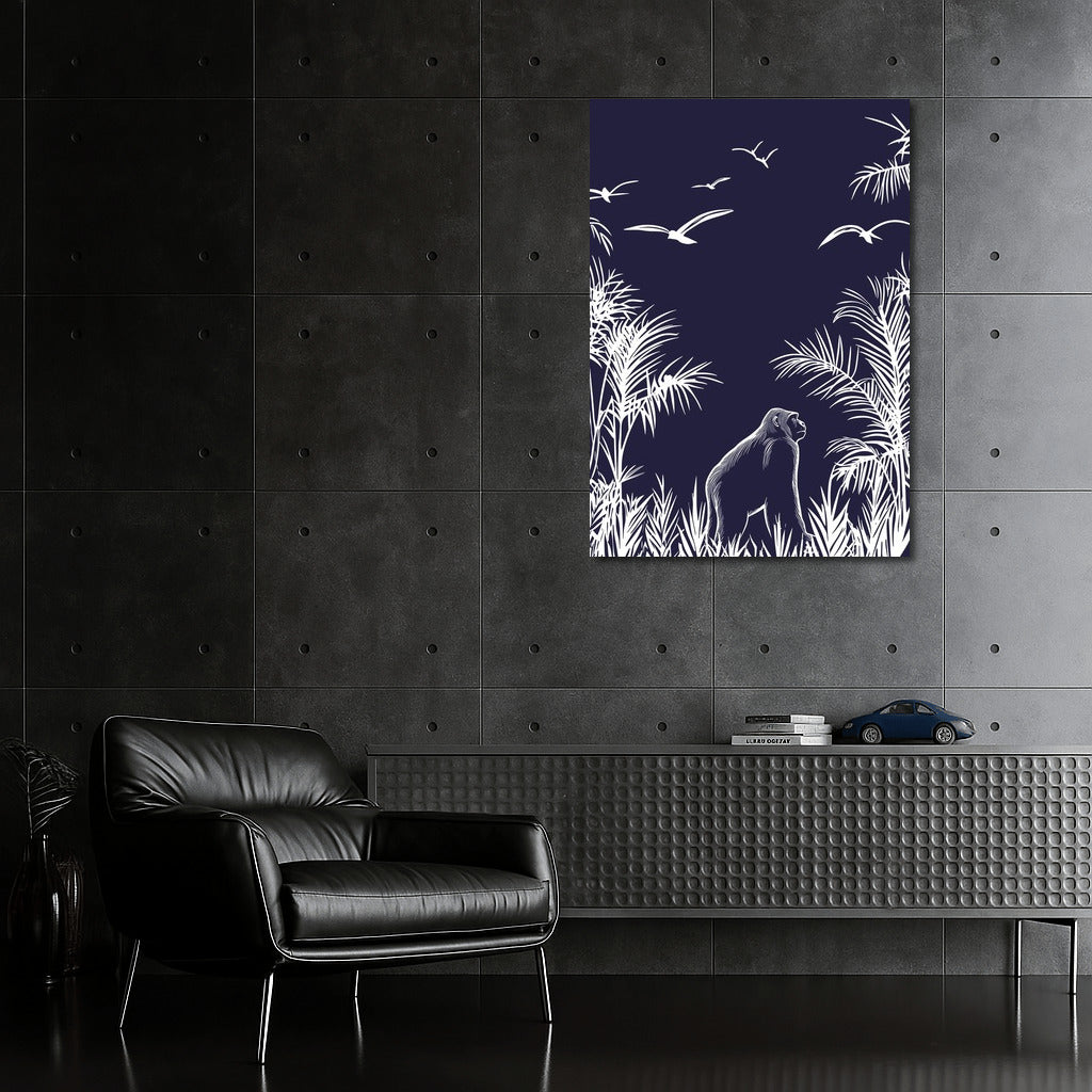 The jungle comes alive in this poster: the subtle contrast of the white silhouette of the gorilla and birds against the dark sky. A real wall art. See more from the collection: Mixed Wall Art