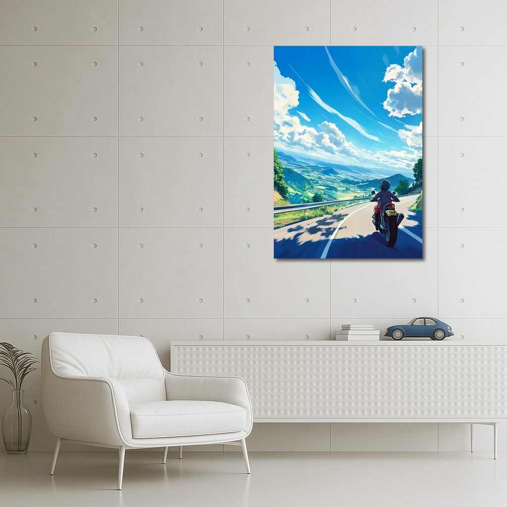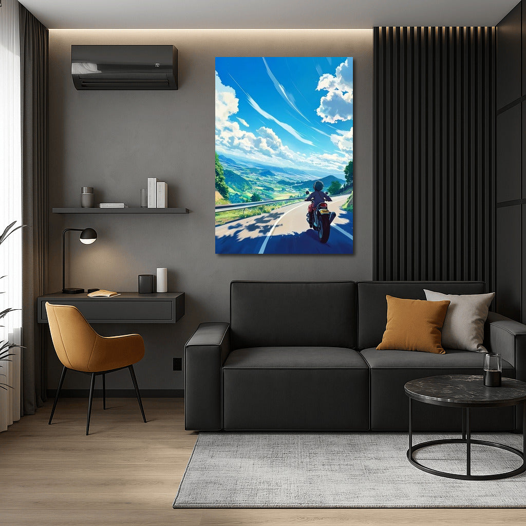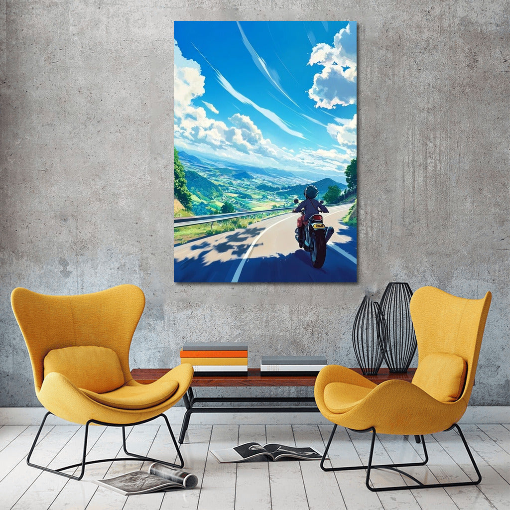 Dynamic poster: a motorcycle rushes along a paintingsque road, opening up exciting horizons. Wall art about freedom and speed. See more from the collection: Anime & Manga genres Art