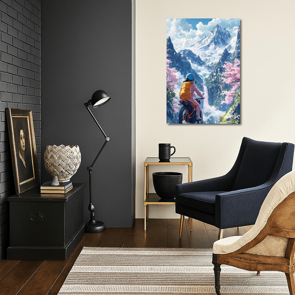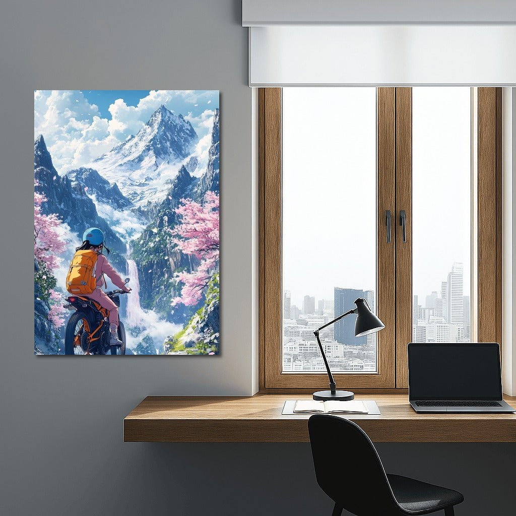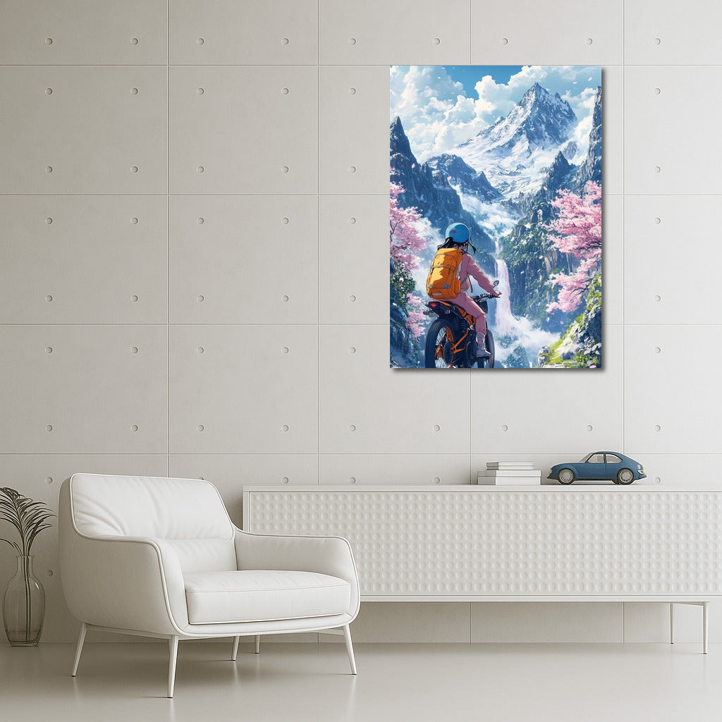 Inspirational poster: A motorcycle journey through fairytale mountains, where nature and adventure meet in harmony. See more from the collection: Anime & Manga genres Art