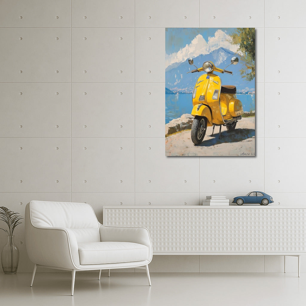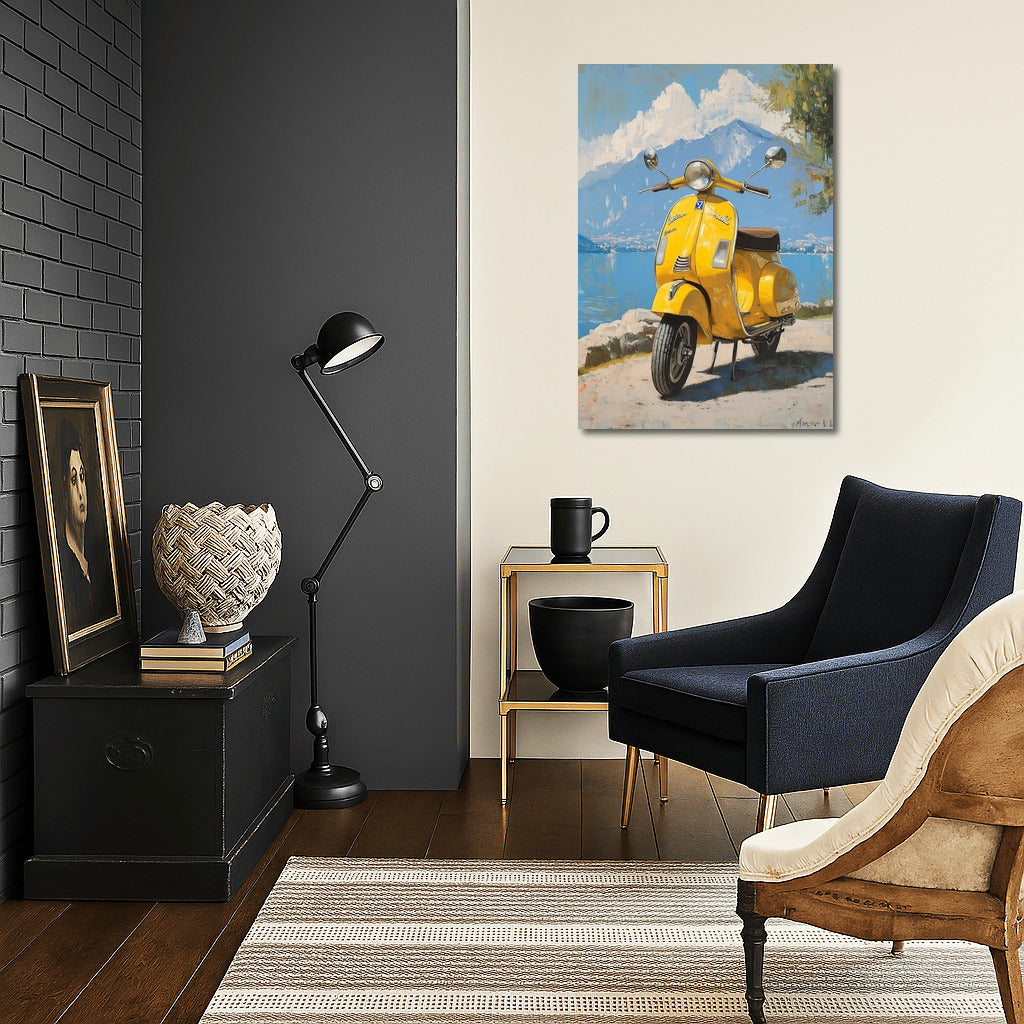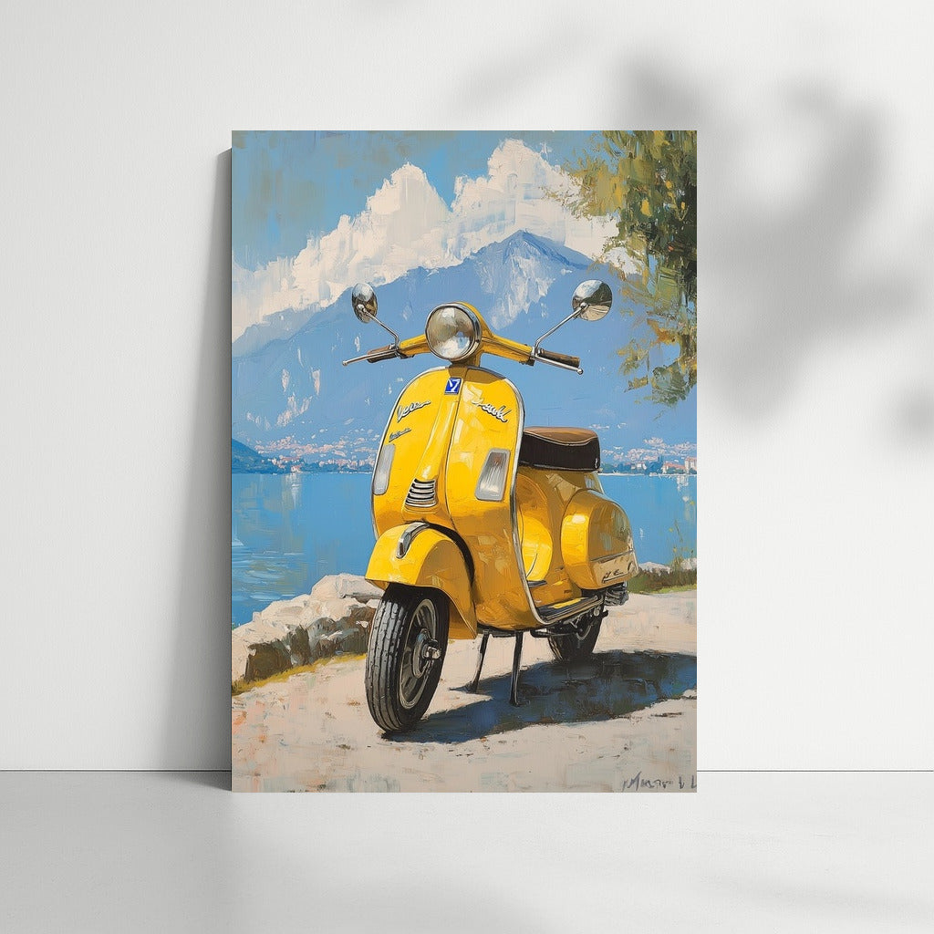 A vibrant poster featuring a retro Vespa scooter with mountains and a lake in the background. Add charm and style to any space with this wall art!