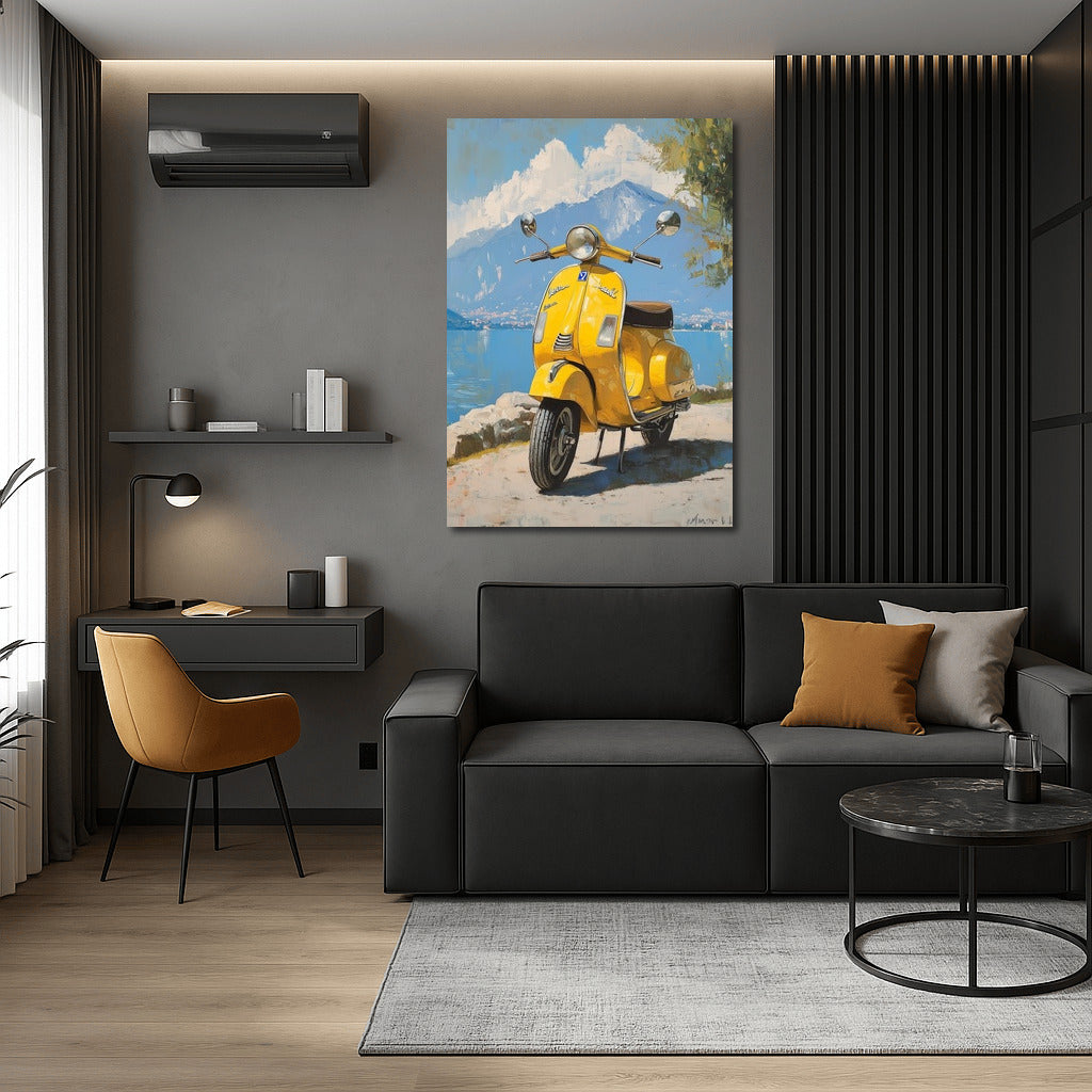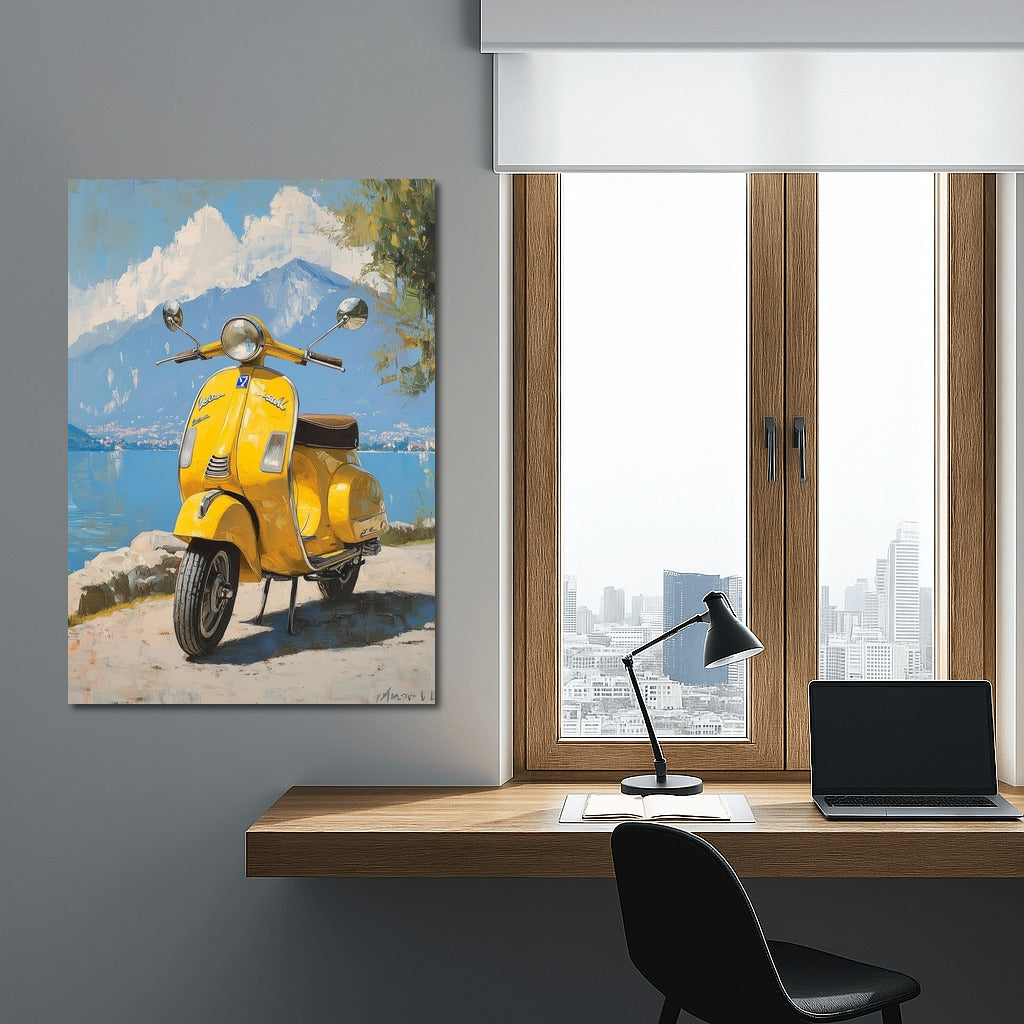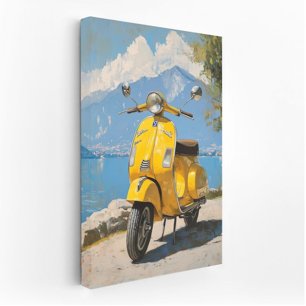 A vibrant poster featuring a retro Vespa scooter with mountains and a lake in the background. Add charm and style to any space with this wall art!