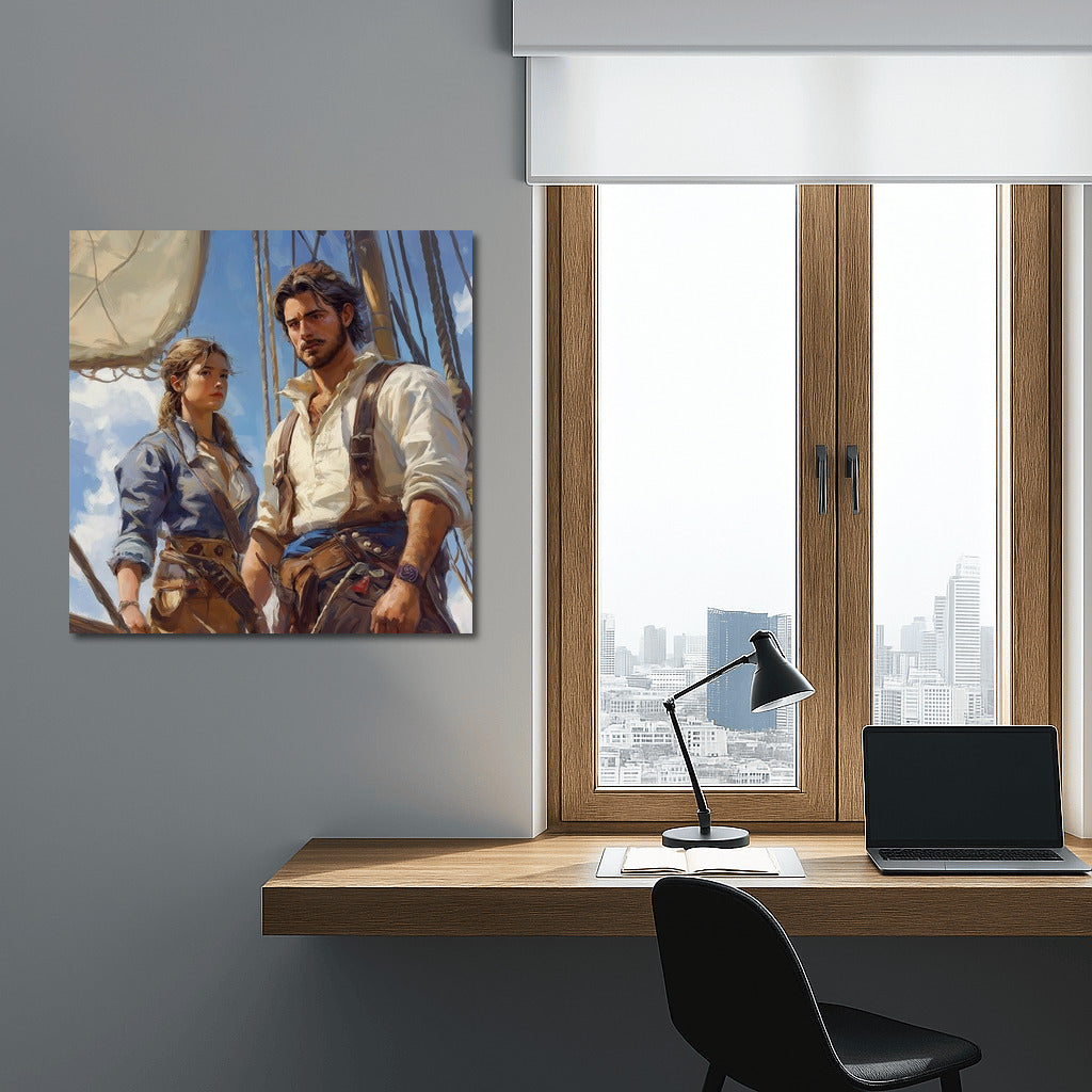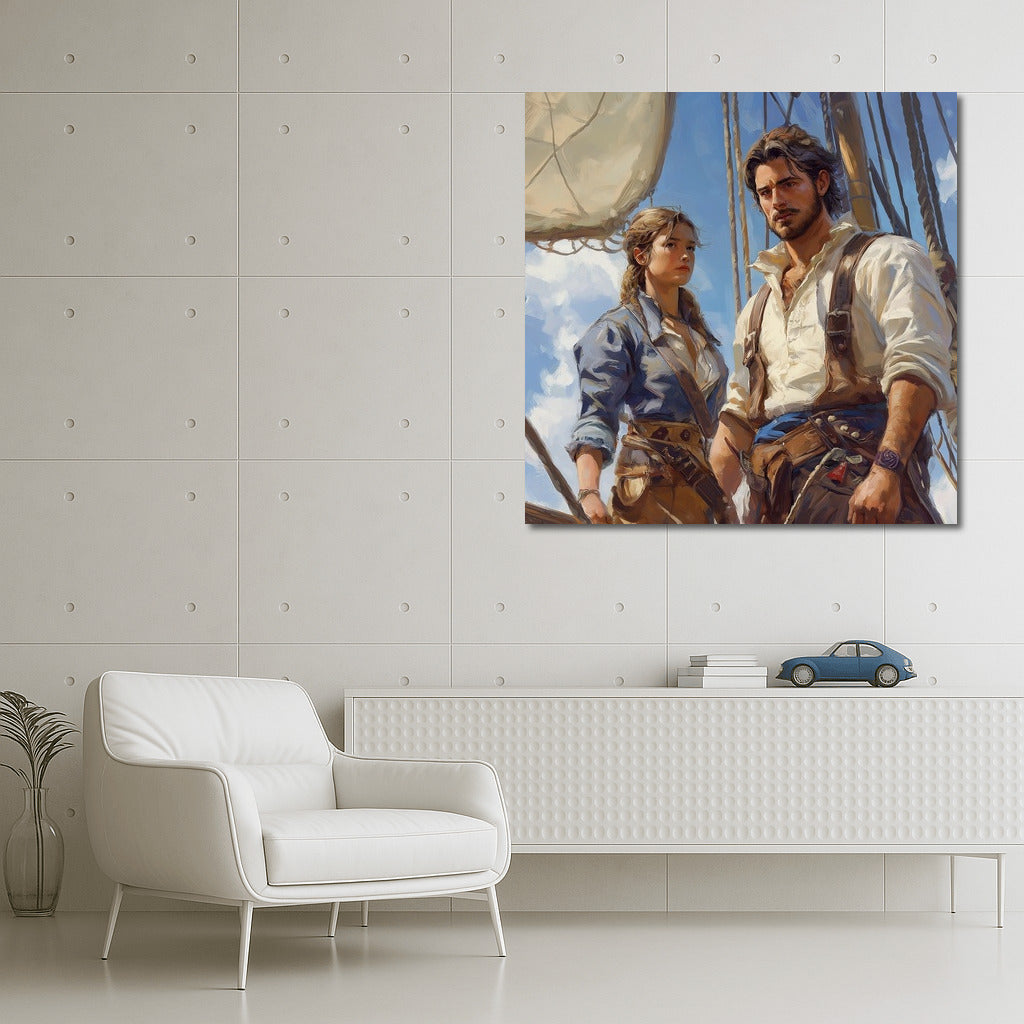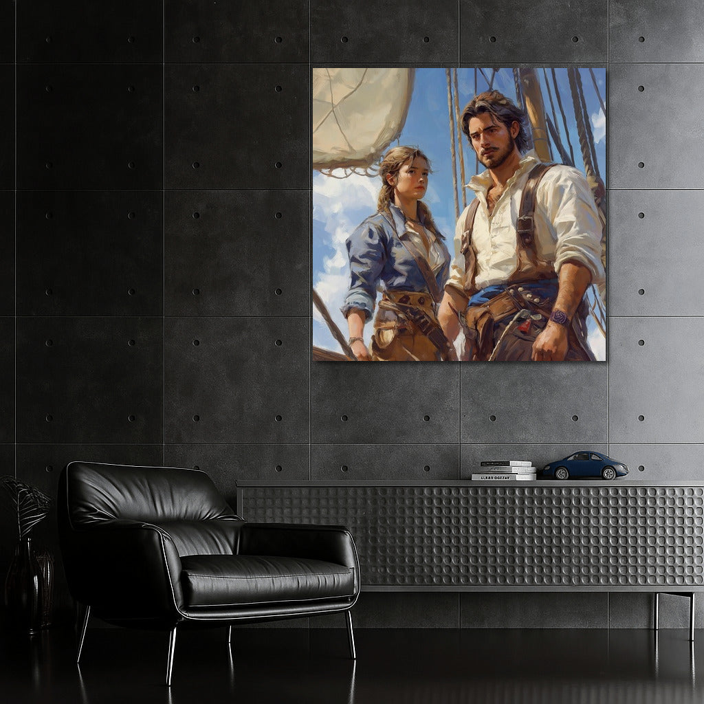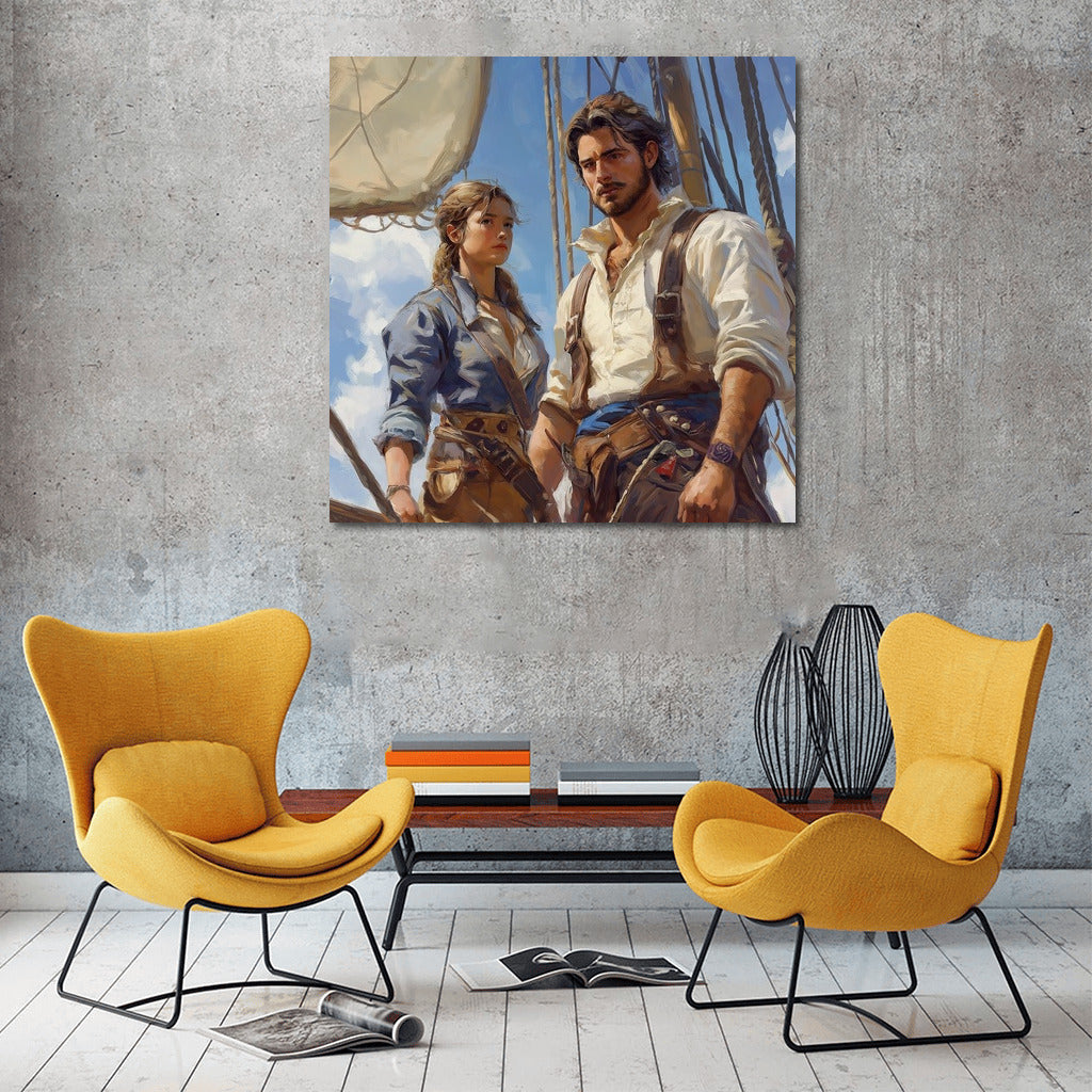 A vibrant painting of a girl and a man on deck, ready to conquer the oceans. Bring sea adventures to life on your walls! See more from the collection: Mixed Wall Art