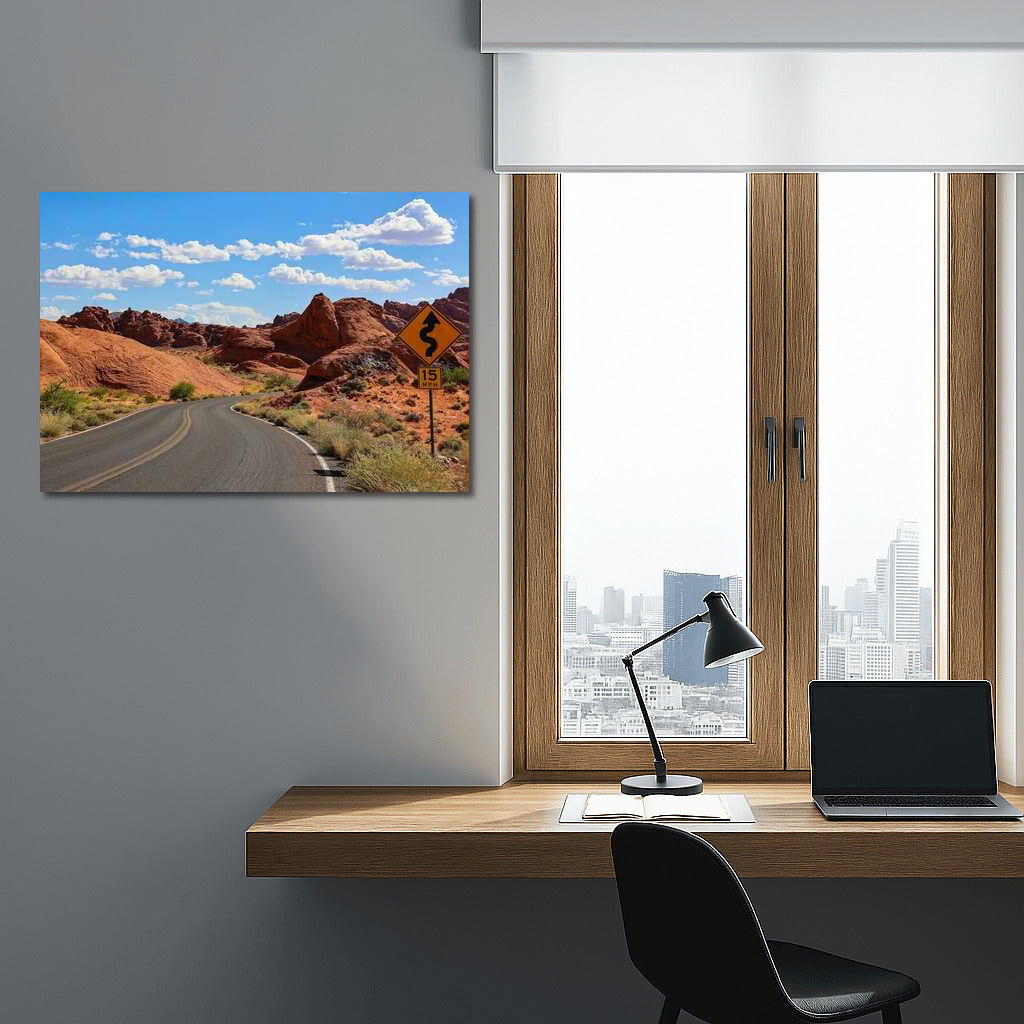Feel the spirit of adventure with this poster of a winding road through the red rocks of Nevada, USA. Nature wall art. See more from the collection: Country Art