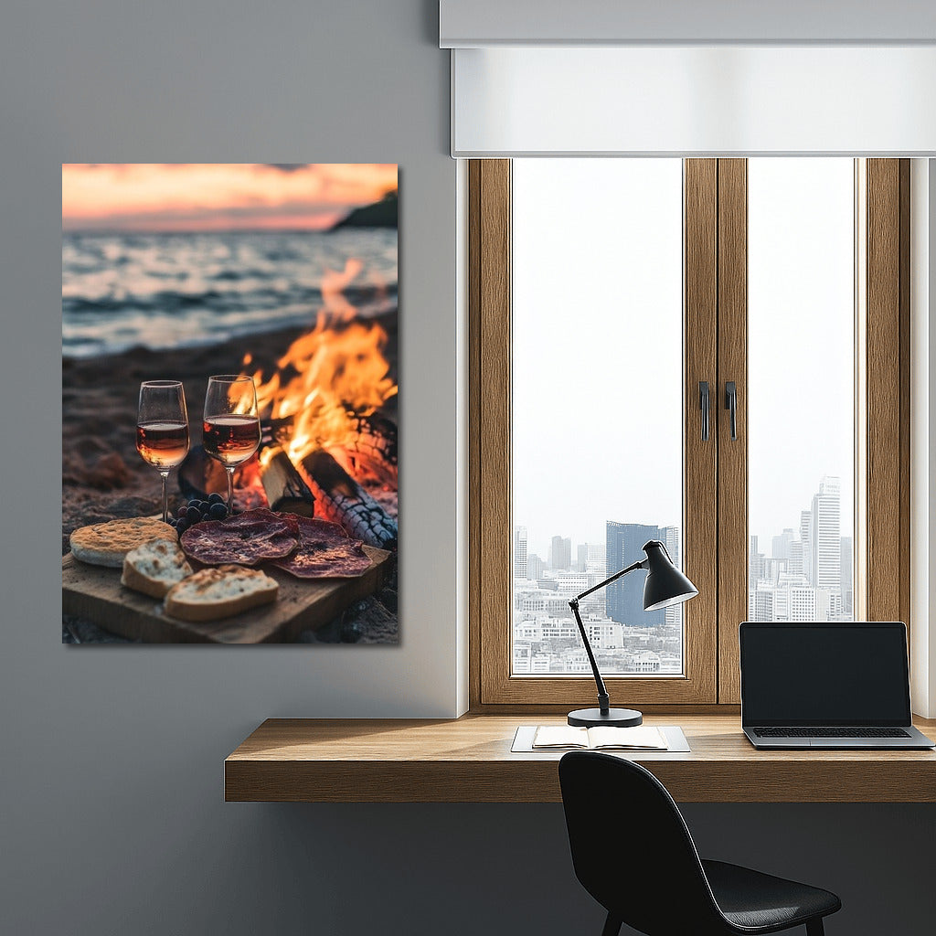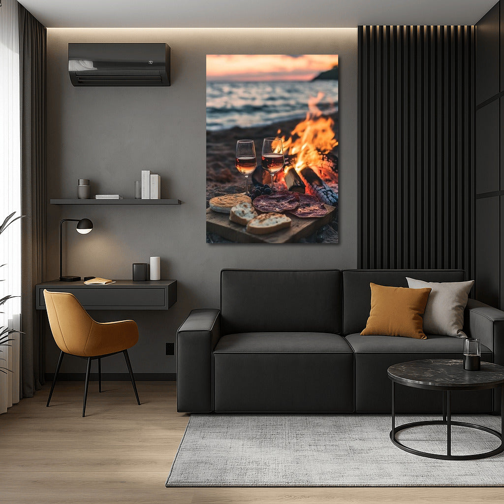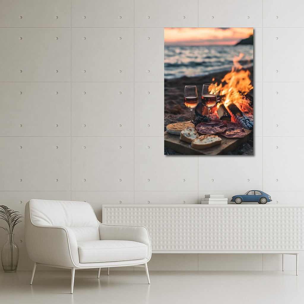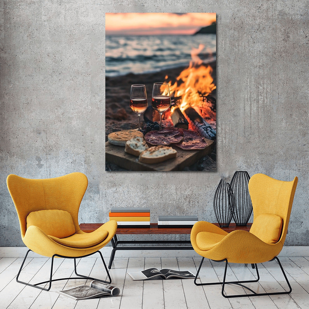 A delicious poster: enjoying a campfire, glasses of wine and snacks by the sea. Perfect wall art for those who appreciate coziness. See more from the collection: Coffee & Tea Art & Drinks