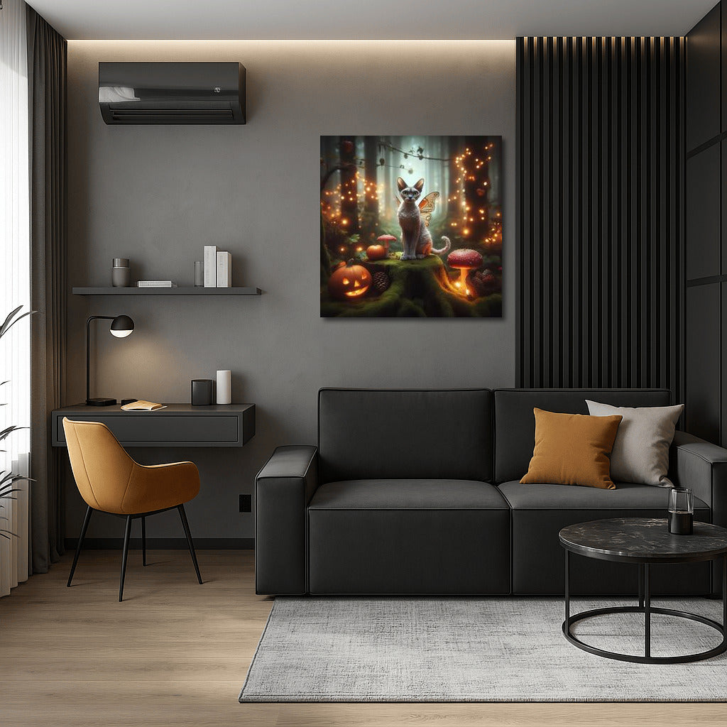 Winged Devon Rex in the Enchanted Forest: A Fantasy of Lights and Pumpkins Wall Art