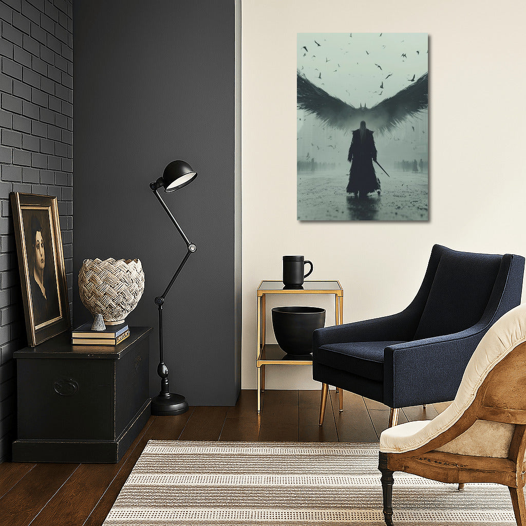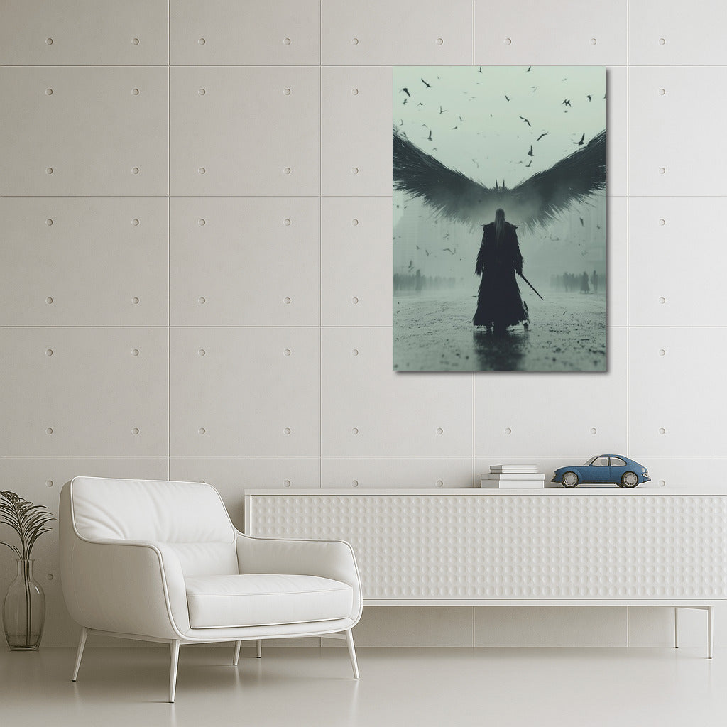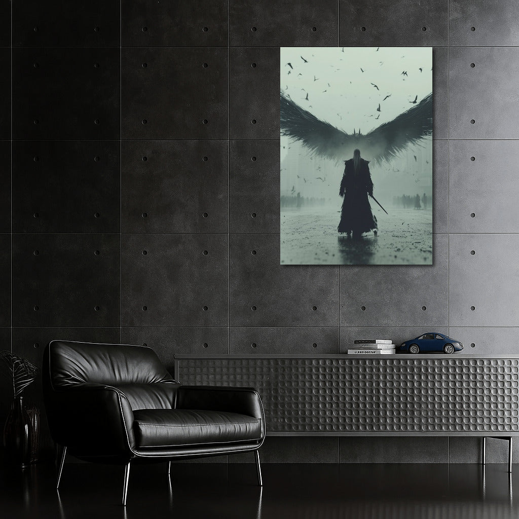Dark Majesty: A poster with a mysterious figure with wings in the middle of the city. The atmosphere of surrealism and power in wall art. See more from the collection: Mixed Wall Art