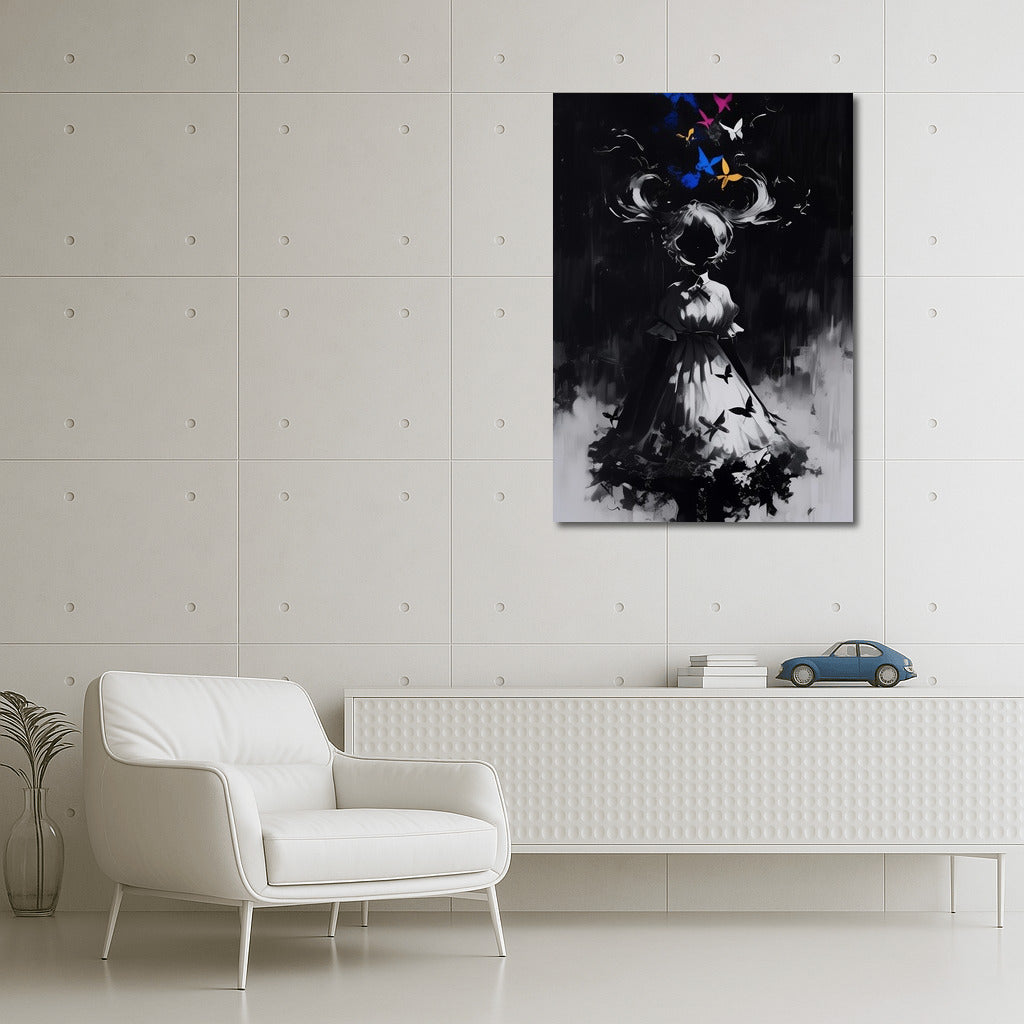 Mystery and magic: the poster comes to life in dark tones, where the silhouette gains wings among bright butterflies. Fairytale wall art. See more from the collection: Mixed Wall Art