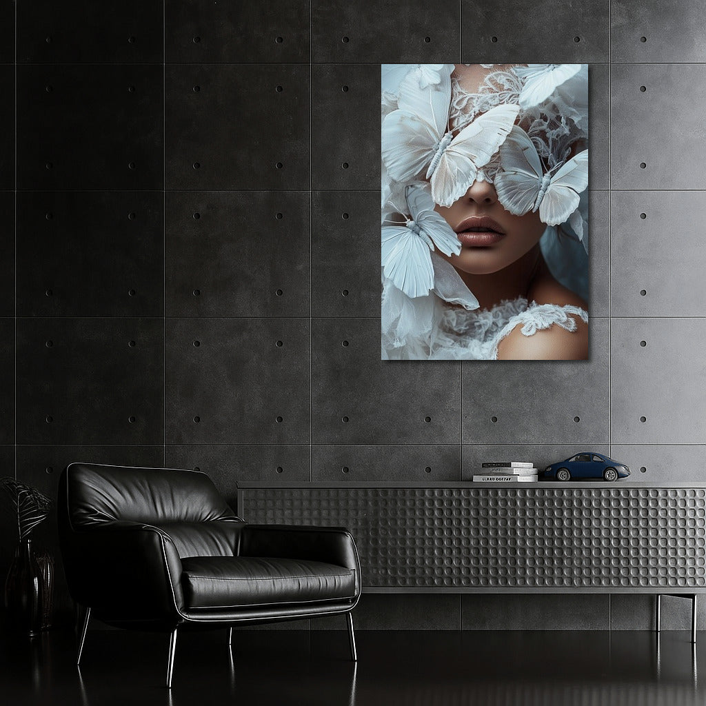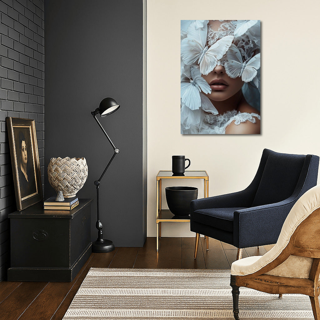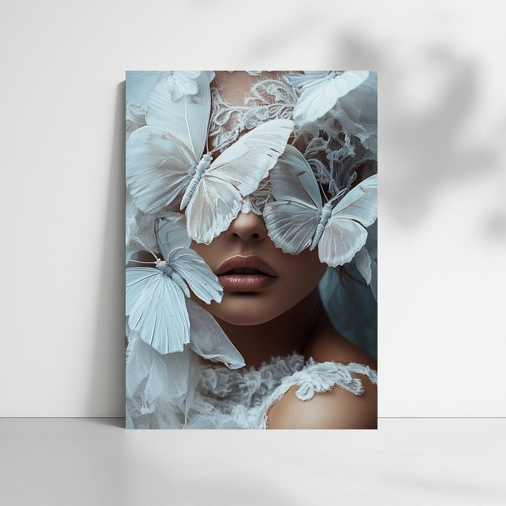 This painting is an immersion into a fantasy world: delicate butterflies frame the face, creating a magical wall art. See more from the collection: Mixed Wall Art