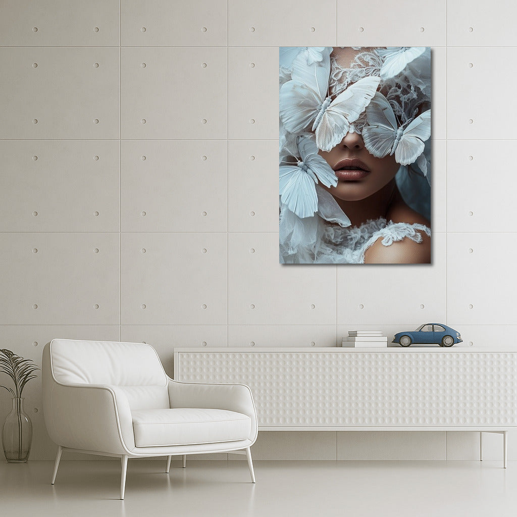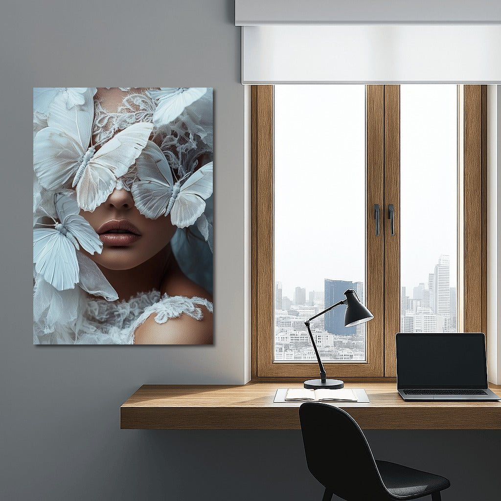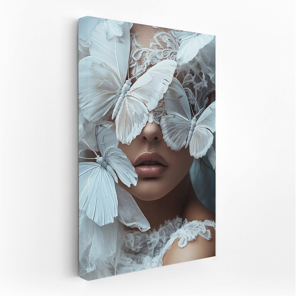 This painting is an immersion into a fantasy world: delicate butterflies frame the face, creating a magical wall art. See more from the collection: Mixed Wall Art