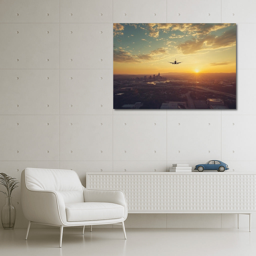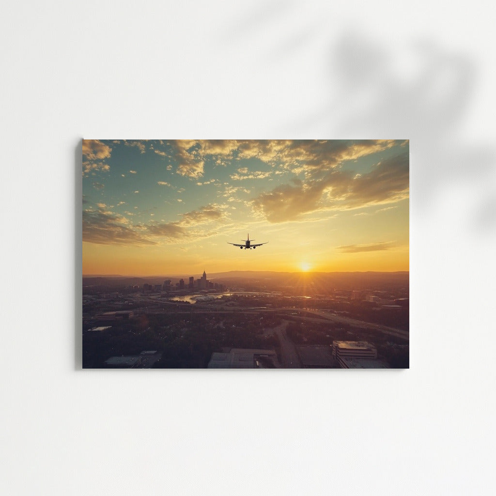 Sunset sky and graceful airplane in flight - a poster that will bring dynamism and dreaminess to your wall art. See more from the collection: Mixed Wall Art