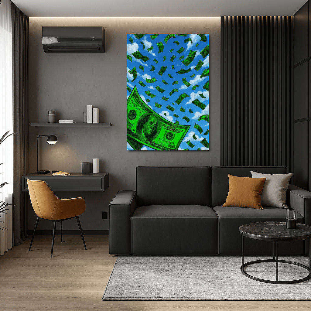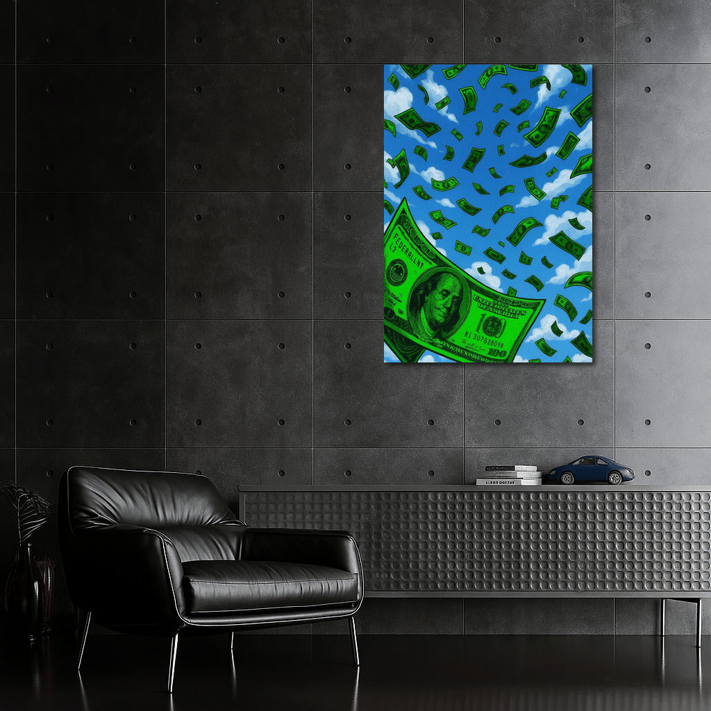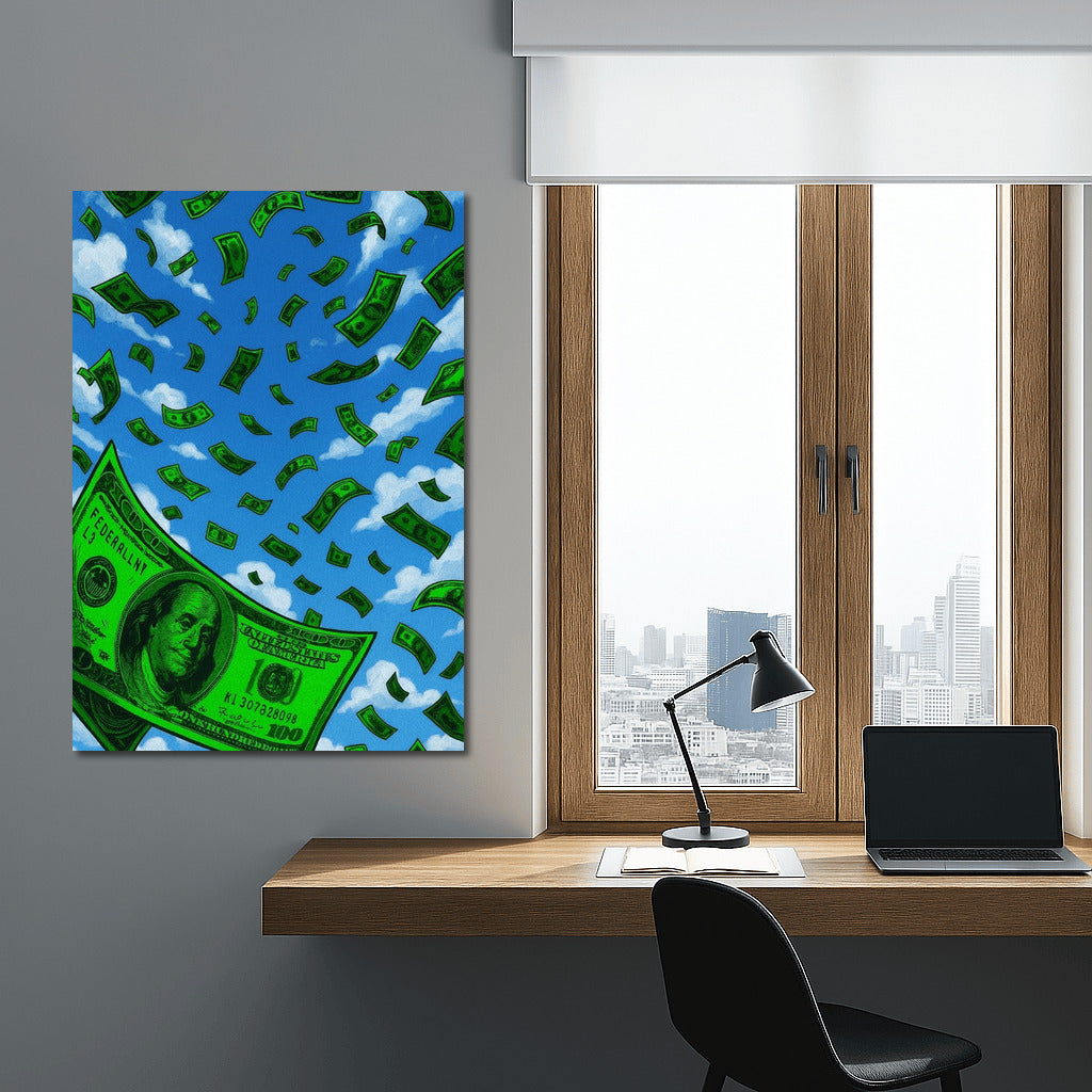 Dynamic poster with a stream of banknotes flying through the sky. Wall art that brings a sense of freedom and wealth. See more from the collection: Money Art