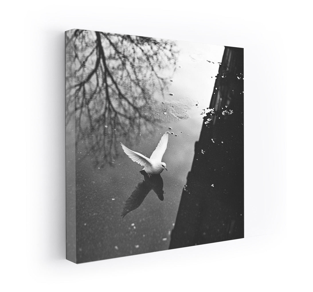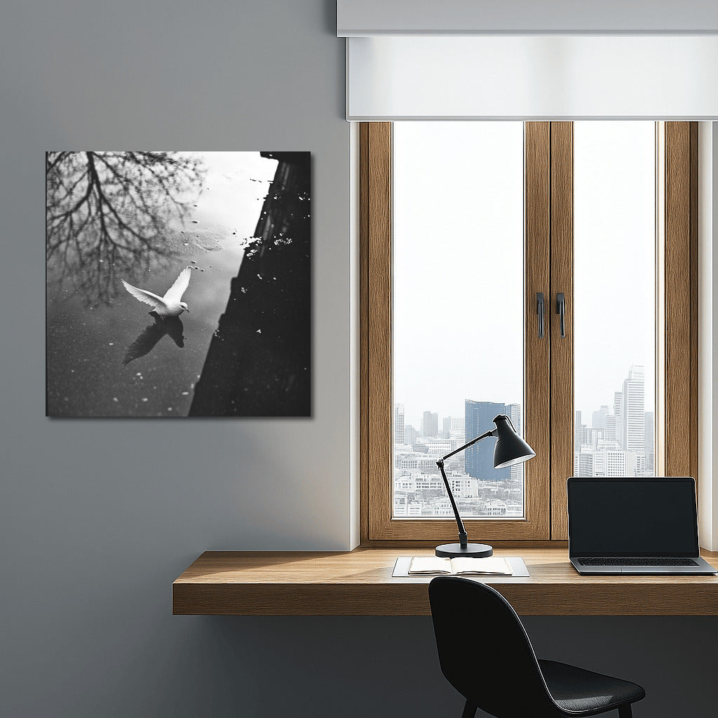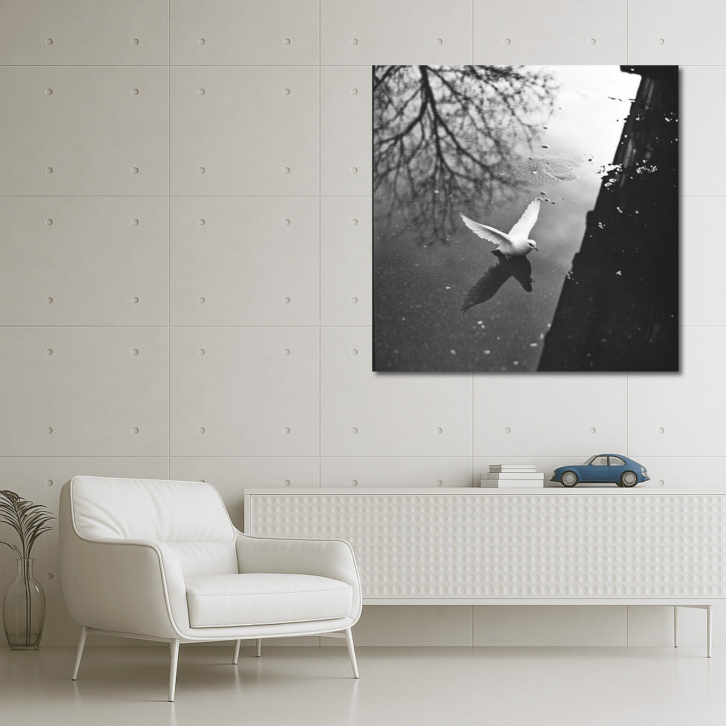 Poster Heavenly Reflection: a bird's gentle flight over water, reflecting serenity and harmony. Ideal wall art. See more from the collection: Mixed Wall Art