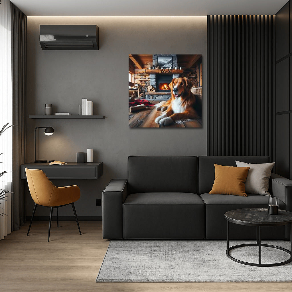 The cozy warmth of a winter evening: a painting of a dog by the fireplace will add harmony and coziness to your wall art. See more from the collection: Animals Art