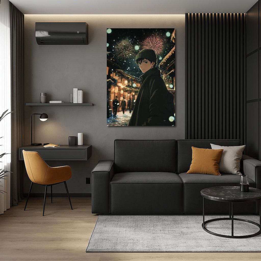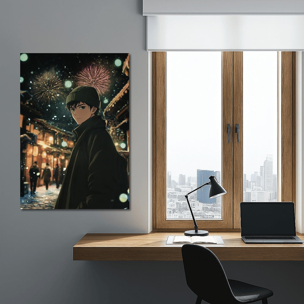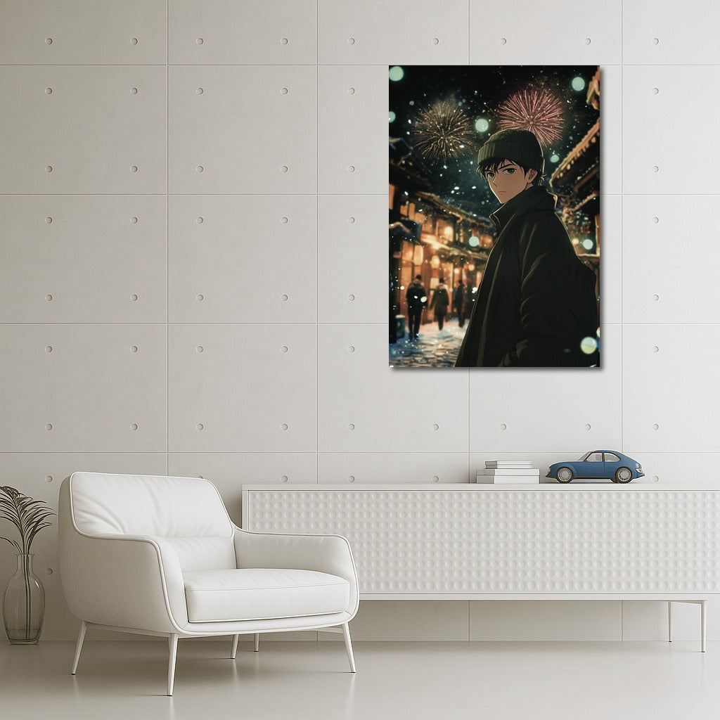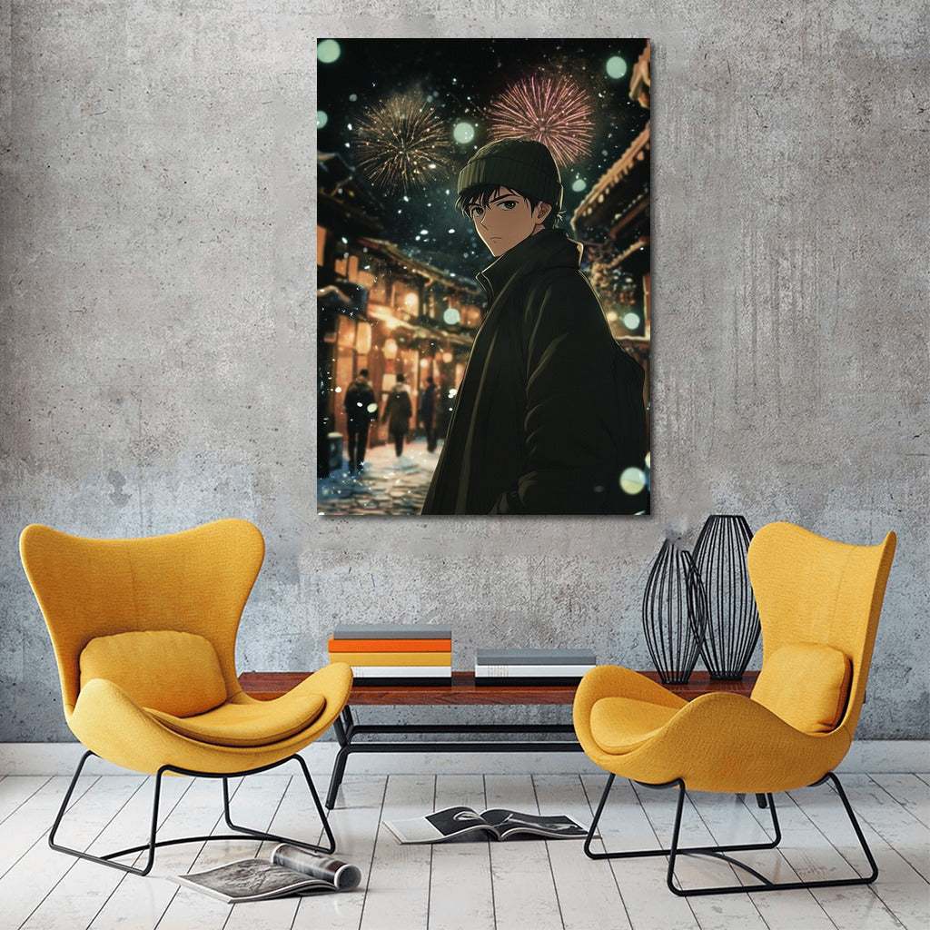 A bright poster with the atmosphere of a winter city, fireworks and a mysterious passerby. Ideal wall art for dreamers. See more from the collection: Anime & Manga genres Art
