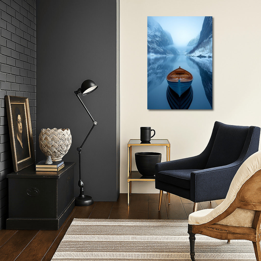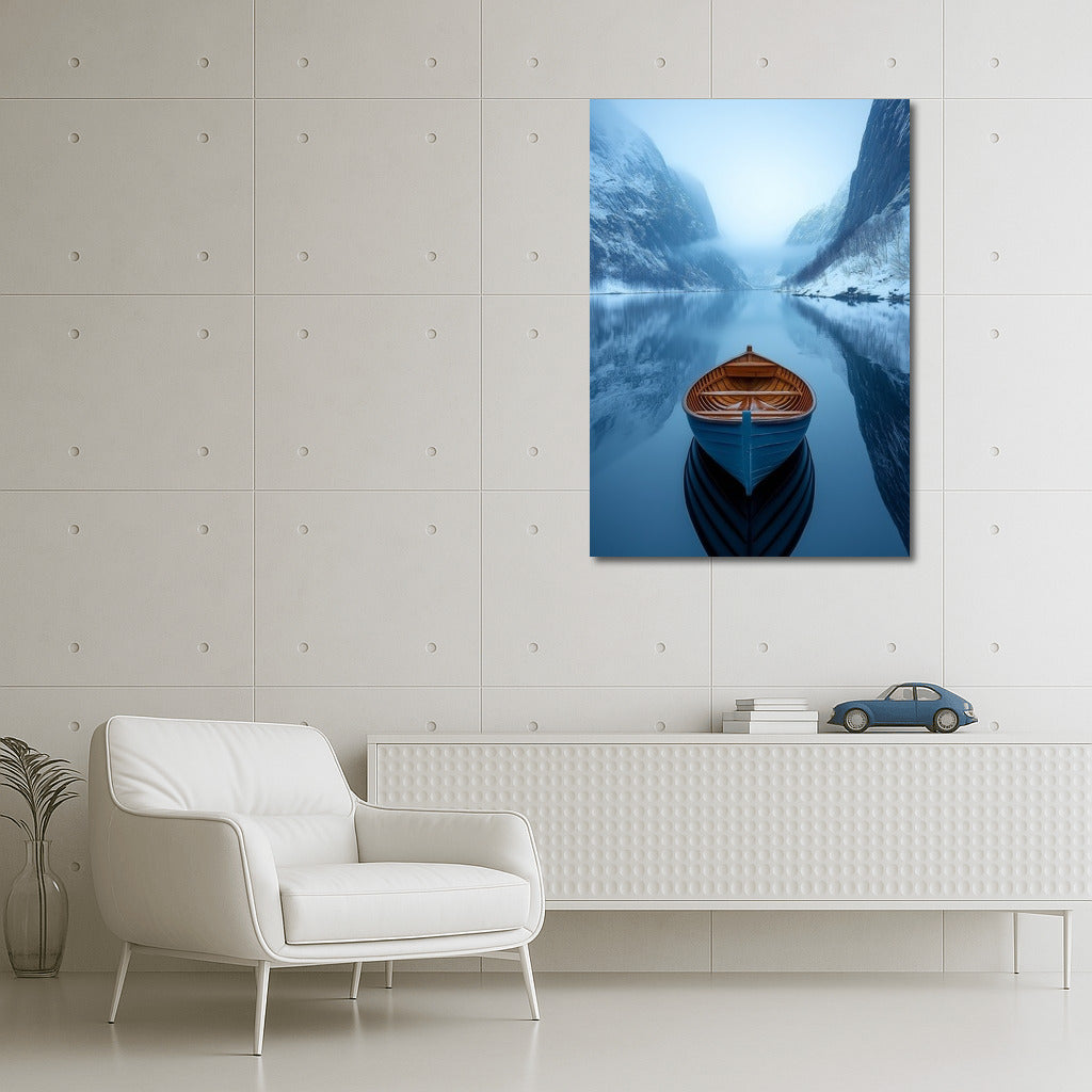 Boat in a winter fjord: immerse yourself in the atmosphere of silence and harmony. The perfect poster for your space. See more from the collection: Lakes & Rivers Art