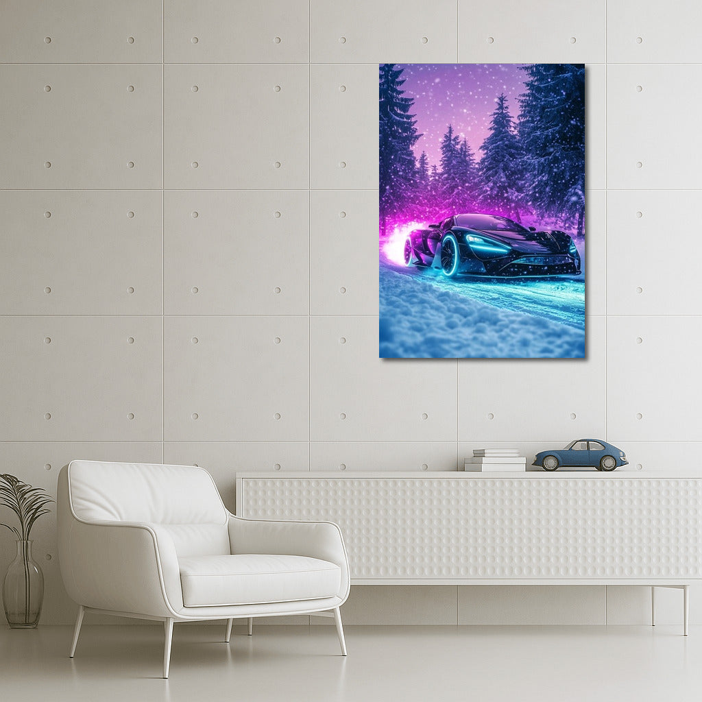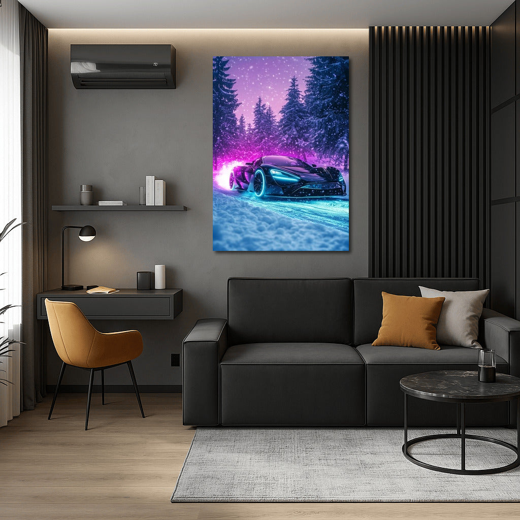 Supercar speeds through a magical winter landscape. The poster will add dynamics and style to your wall art! See more from the collection: McLaren Art