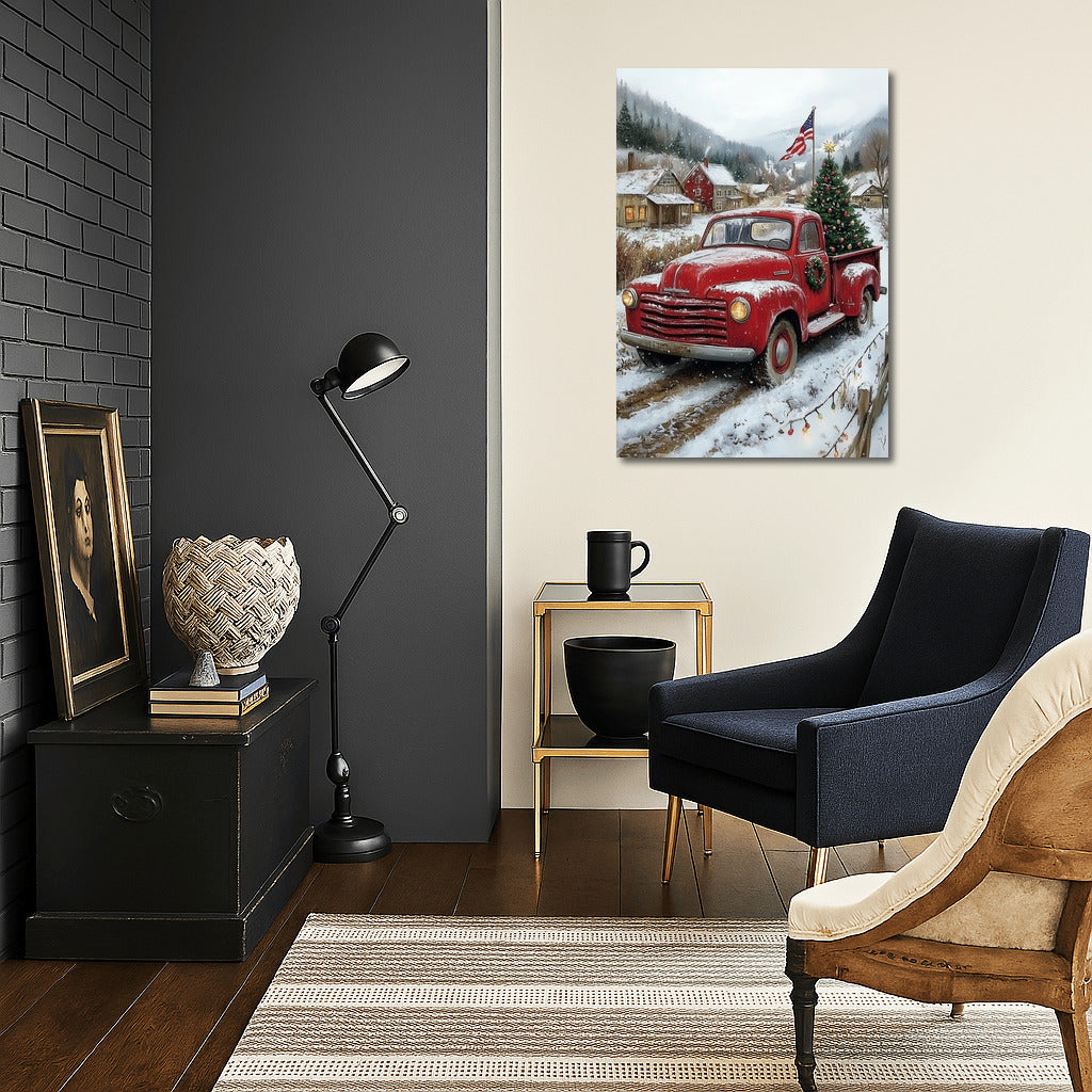 A colorful poster with a retro Chevrolet truck against the backdrop of a winter village. A festive and cozy atmosphere in your home!