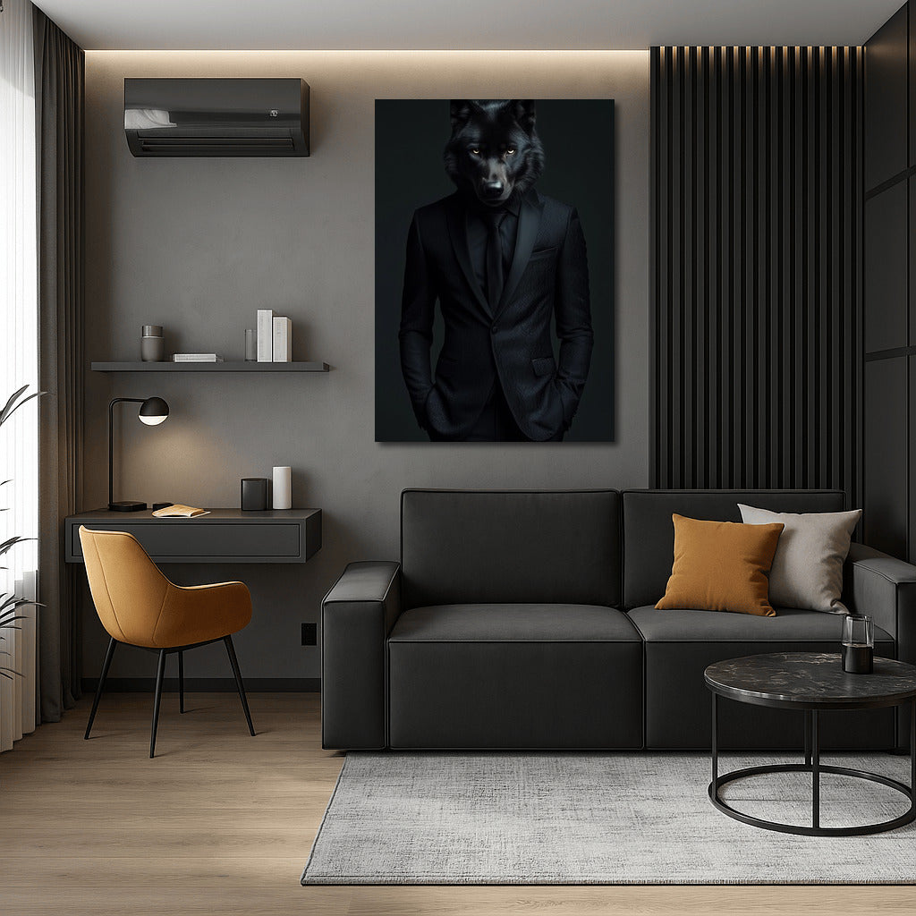 Elegant poster: a mysterious wolf in a suit. Wall art for those who appreciate style and the power of nature in one image. See more from the collection: Mixed Wall Art