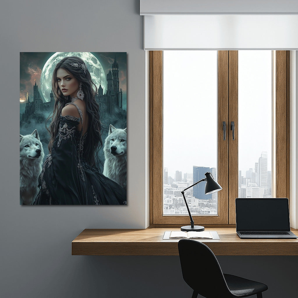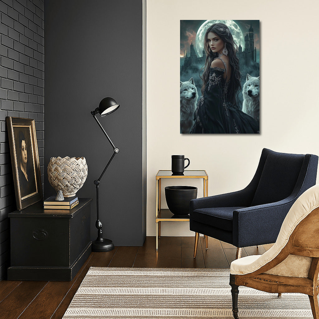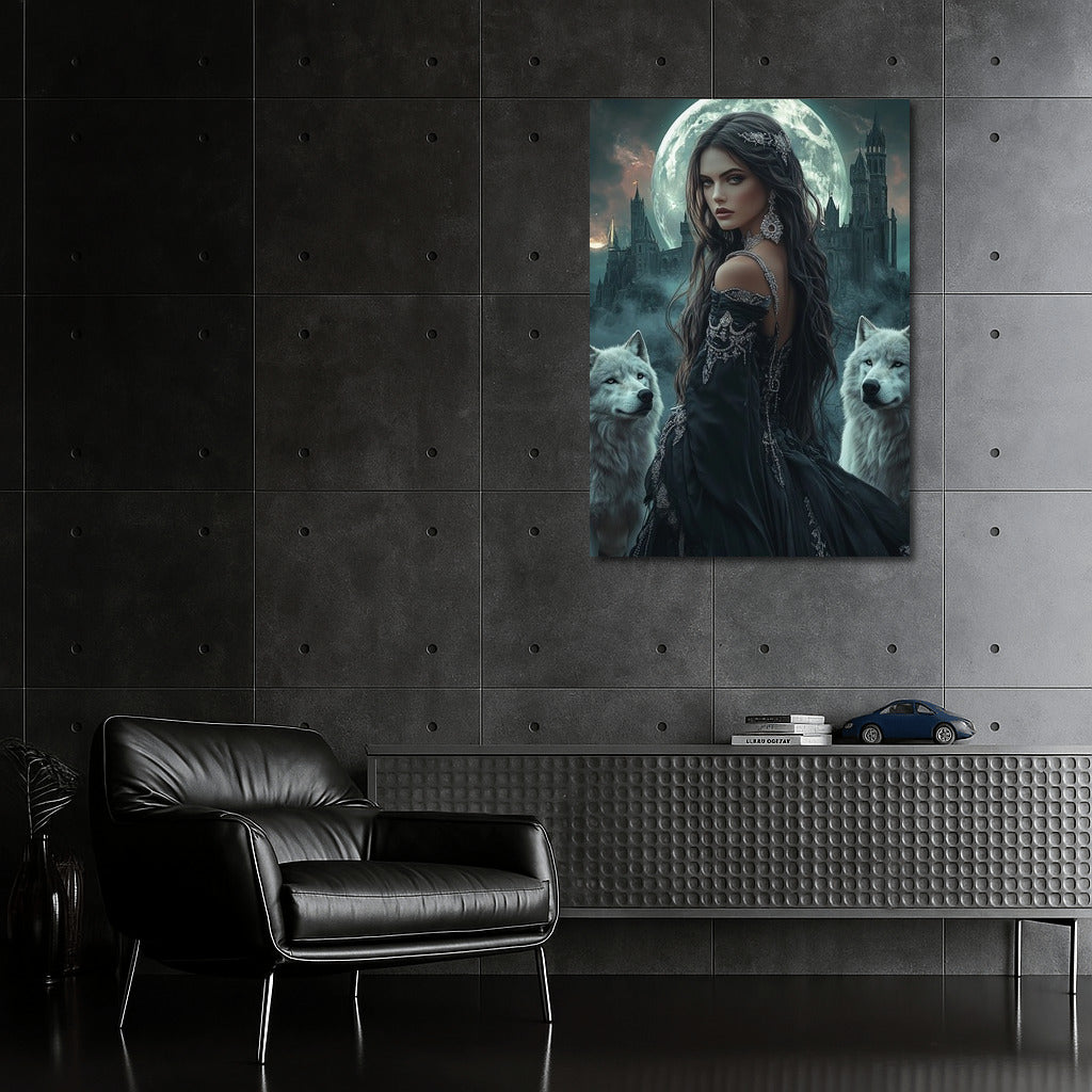 Moon magic comes to life in this mysterious poster: an illusory figure with wolves in front of a majestic castle. Perfect wall art! See more from the collection: Mixed Wall Art