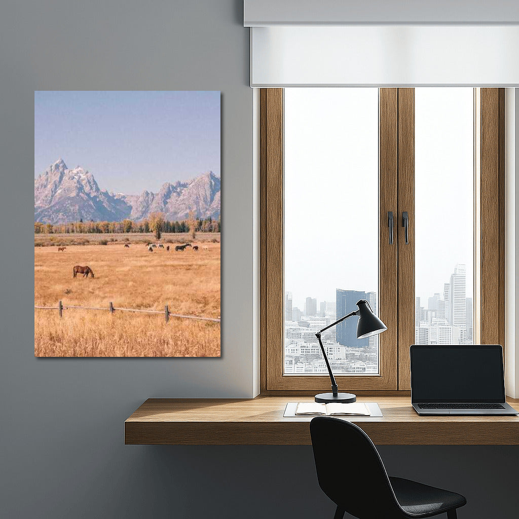 Immerse yourself in the grandeur of Wyoming with this poster: mountains, prairie, and free-ranging horses make for the perfect wall art. See more from the collection: Country Art