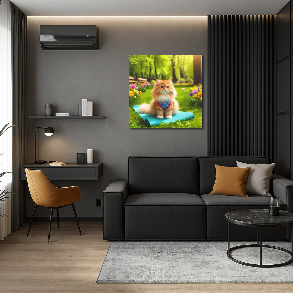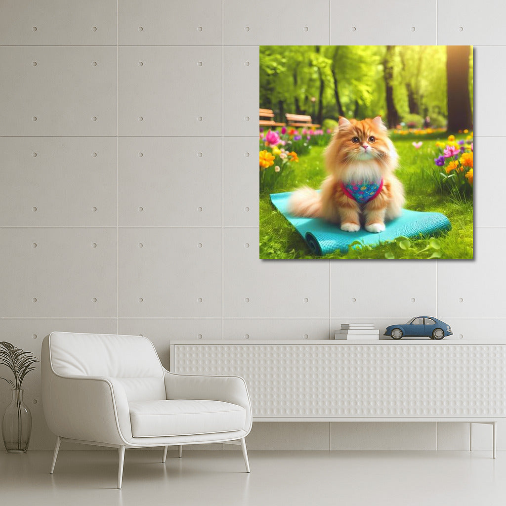 Cat on a yoga mat in the park. Inspiring wall art to create harmony and comfort in your home! See more from the collection: Animals Art
