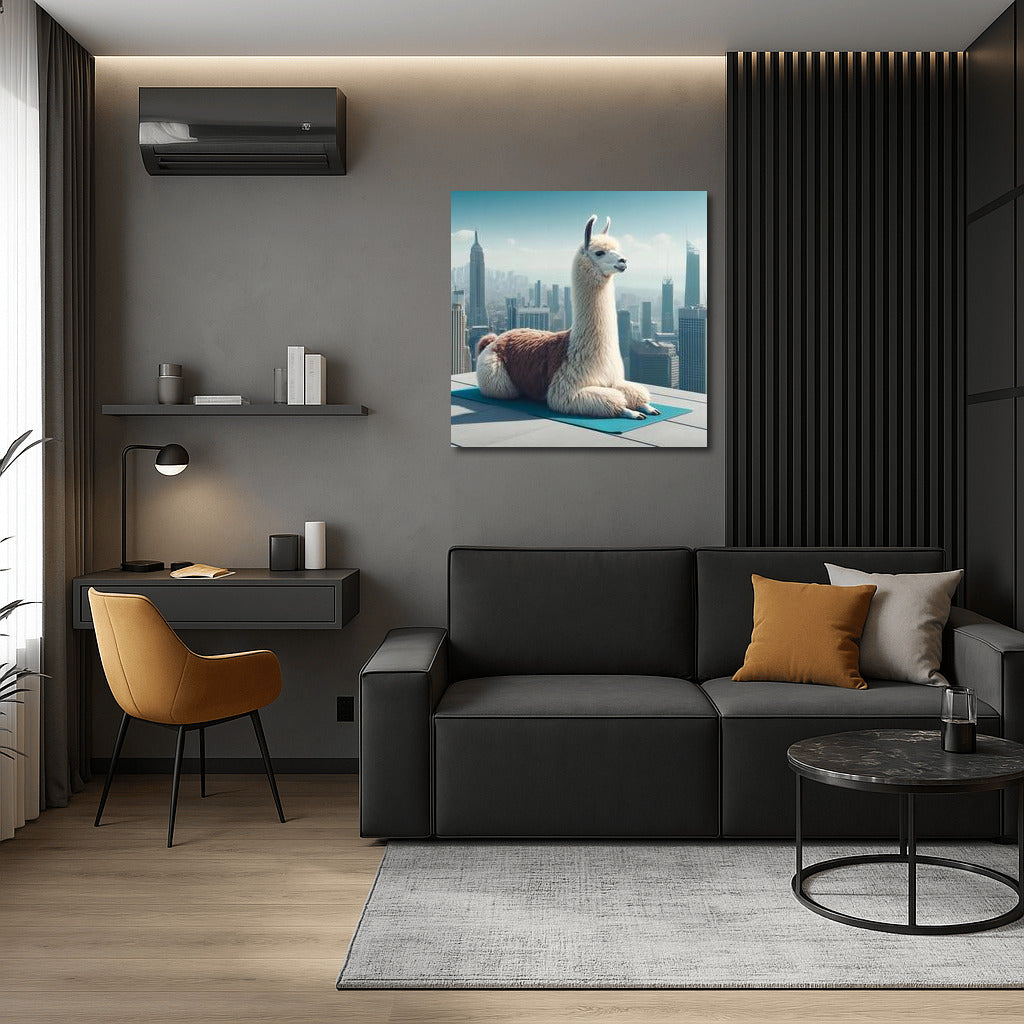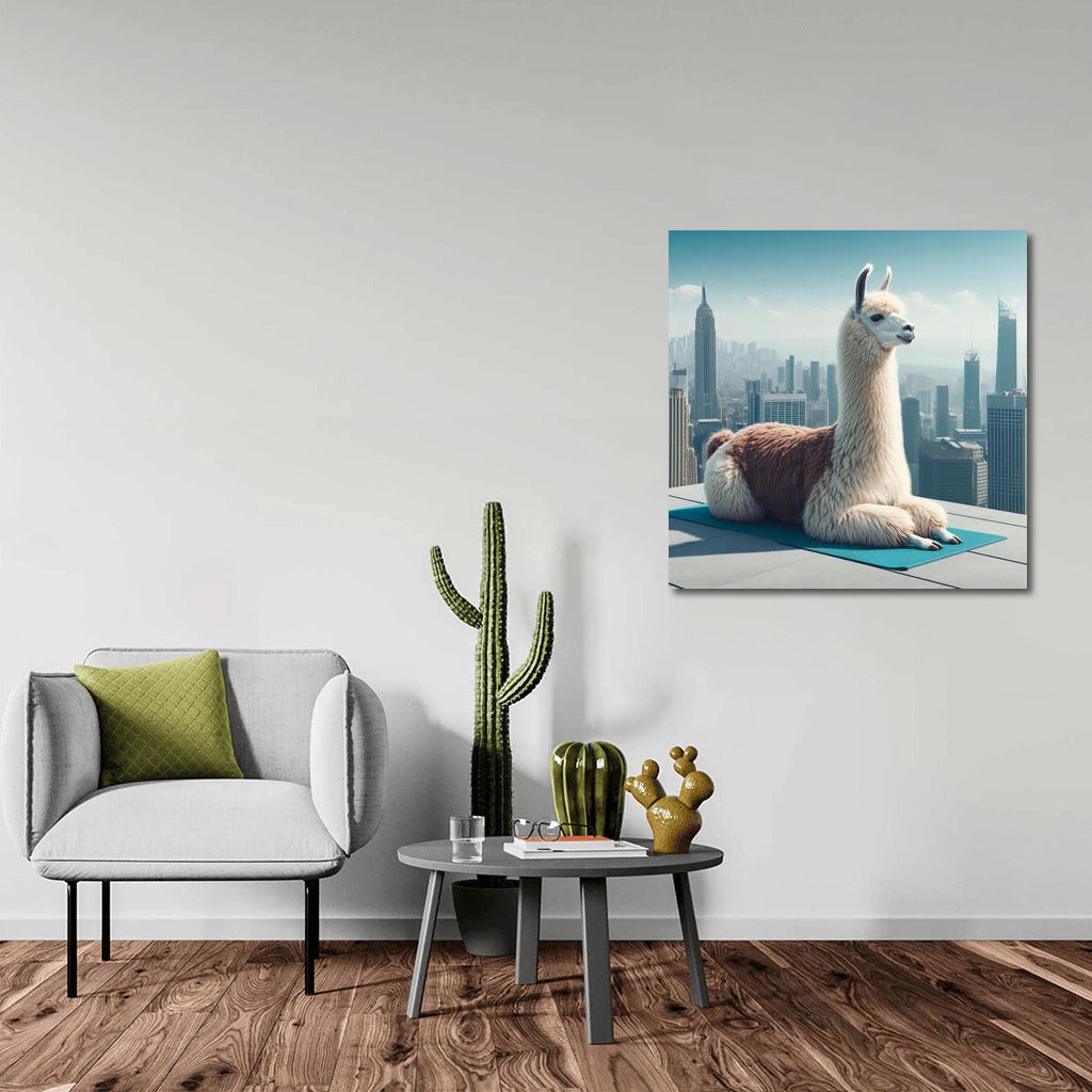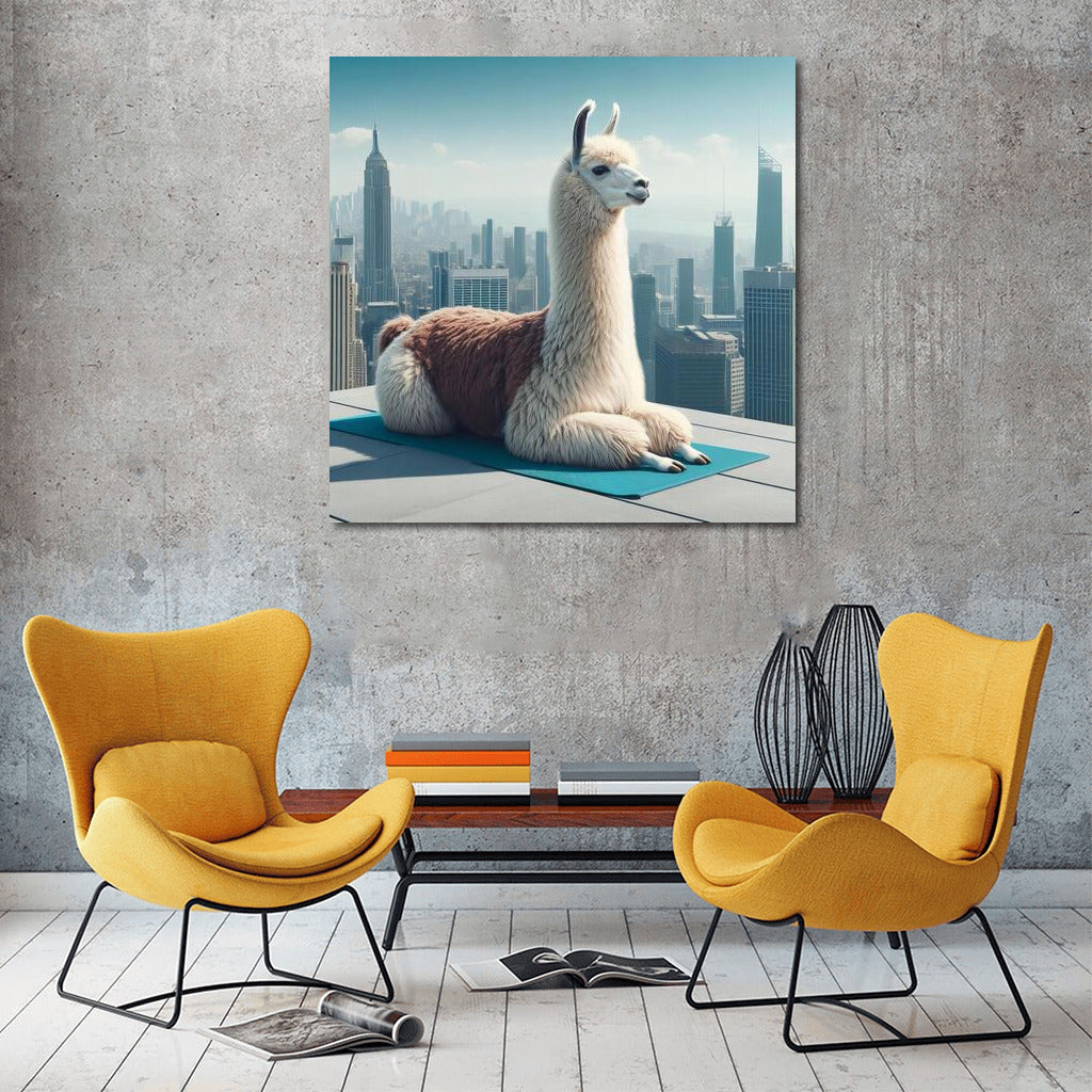 A llama doing yoga on the roof of a skyscraper. This poster is the perfect wall art for achieving zen in the concrete jungle. See more from the collection: Alpaca & Llama Art