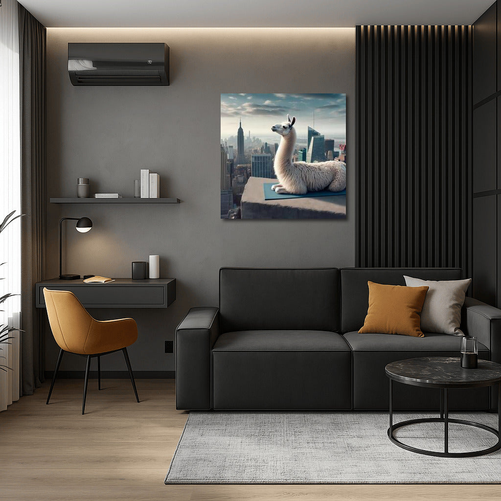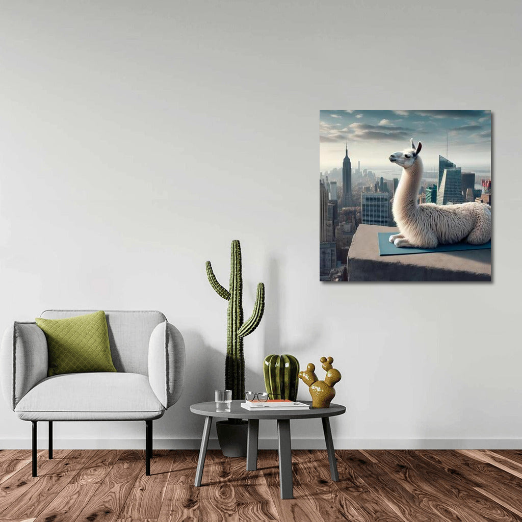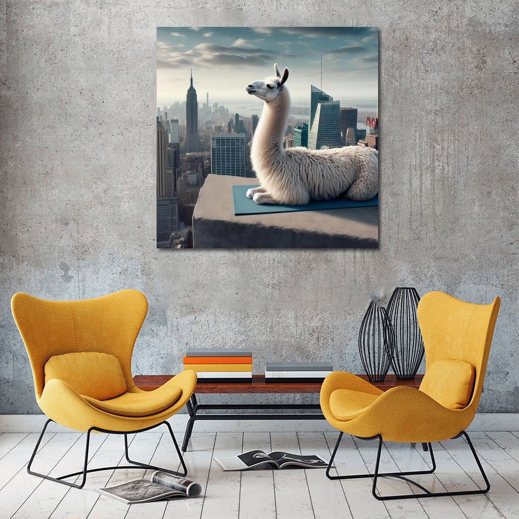 Llama doing yoga on the roof of a skyscraper. Inspirational poster will become a bright accent in your wall art! See more from the collection: Alpaca & Llama Art