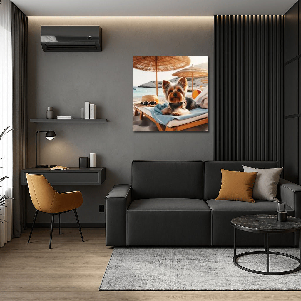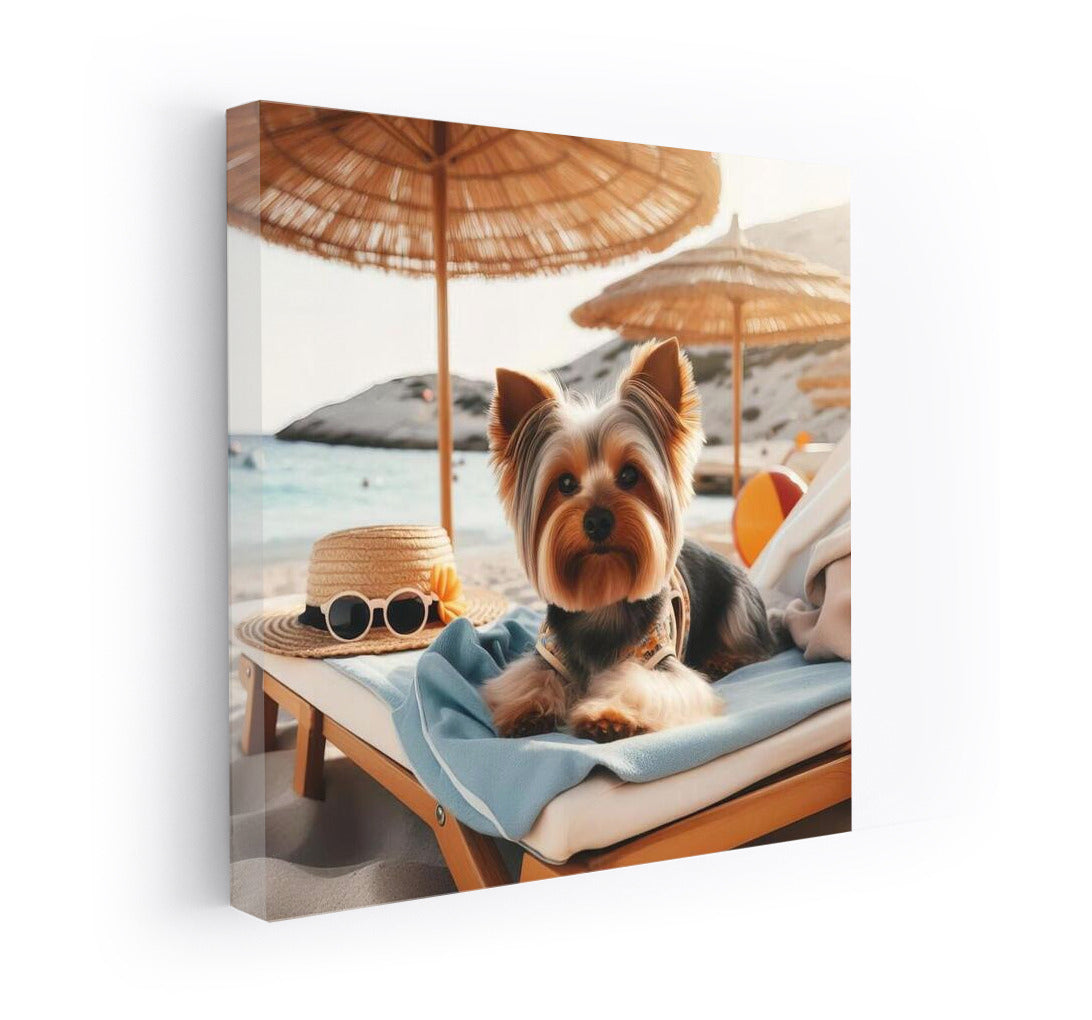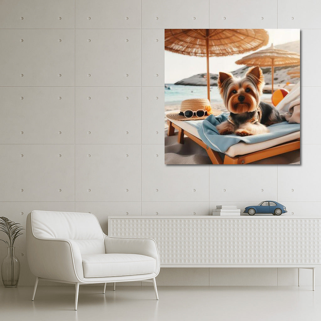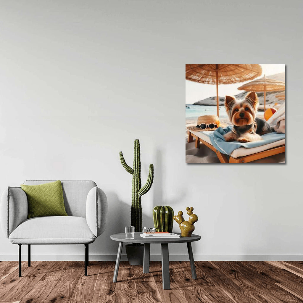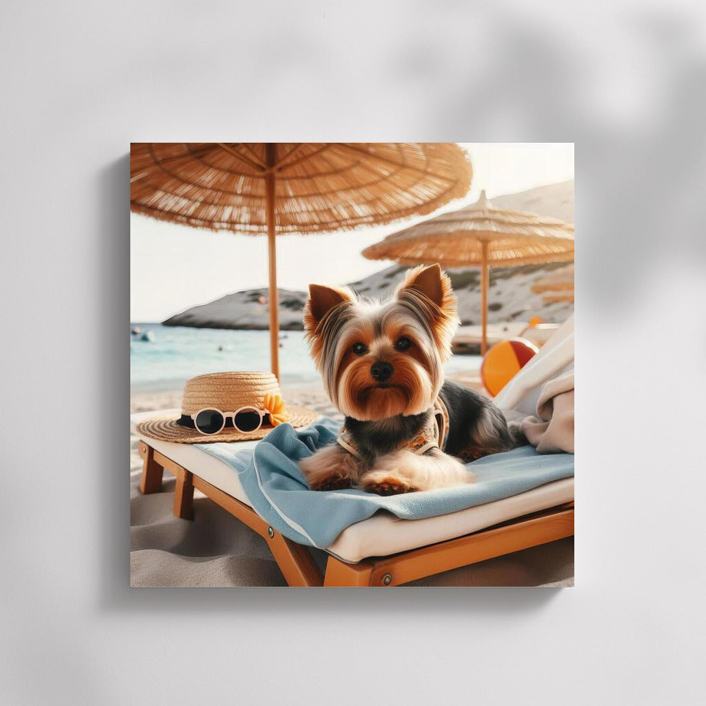 Yorkshire Terrier on the beach relaxing under an umbrella. A poster that will add a summer mood to your home! See more from the collection: Animals Art
